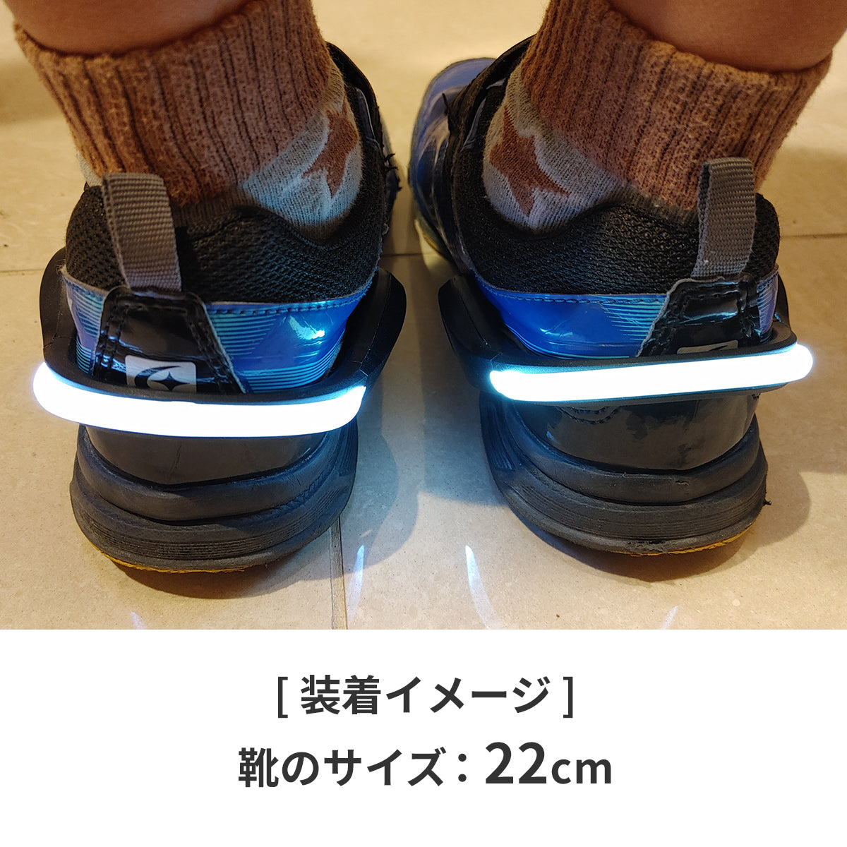 シューズのかかと部分に装着するセーフティーライト。かかと部分に装着するため、自分の背後から来る車などにライトで自分の存在を知らせることができます。
