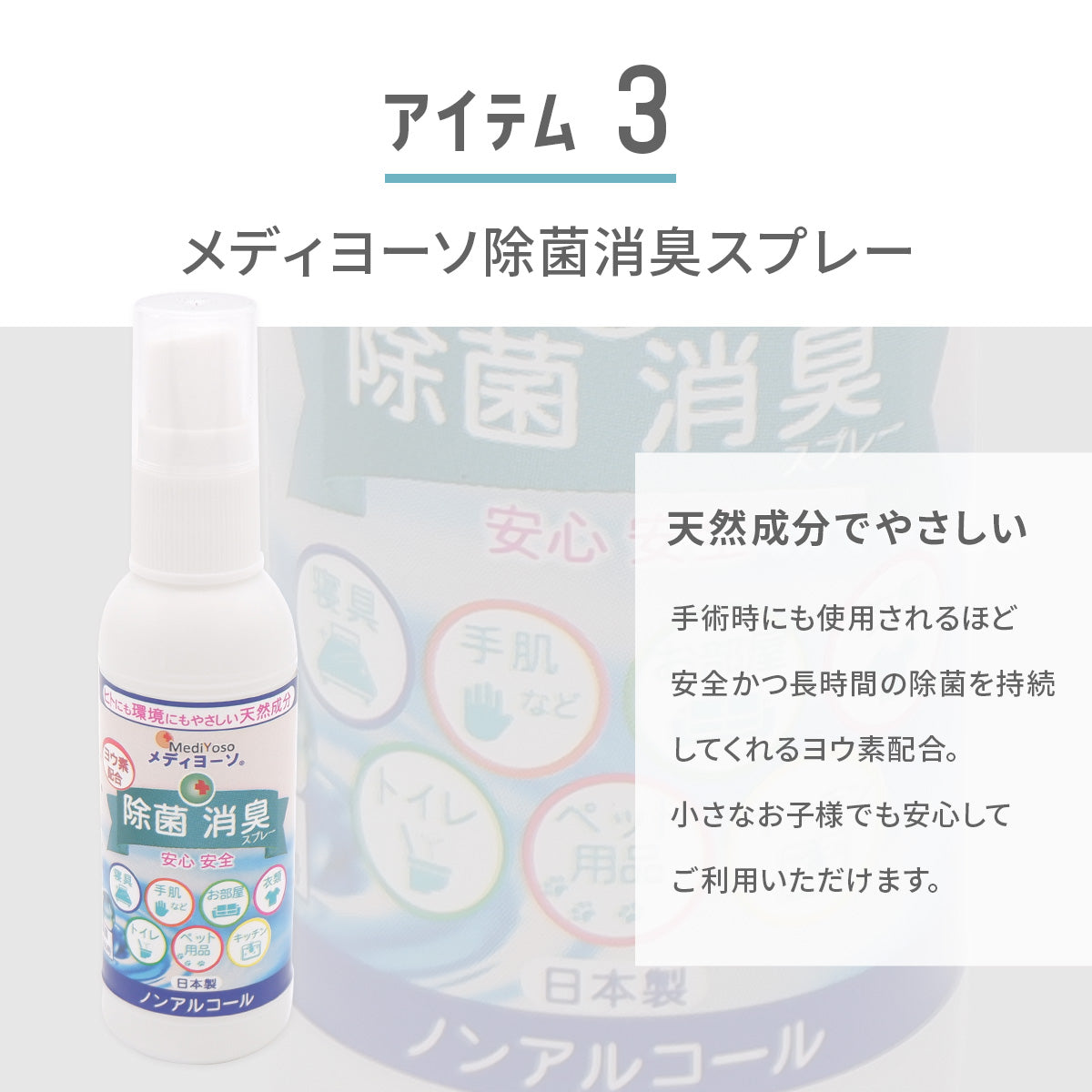 【アイテム3  メディヨーソ除菌消臭スプレー】ヨウ素成分配合のヒトにも環境にもやさしい、安心安全な除菌・消臭スプレー! 天然成分なので幅広くご使用頂けます。寝具や手肌、お部屋や衣類などにスプレーするだけ! ●使用方法 20~30mくらい離して適量を(2~3プッシュ)スプレーしてください。