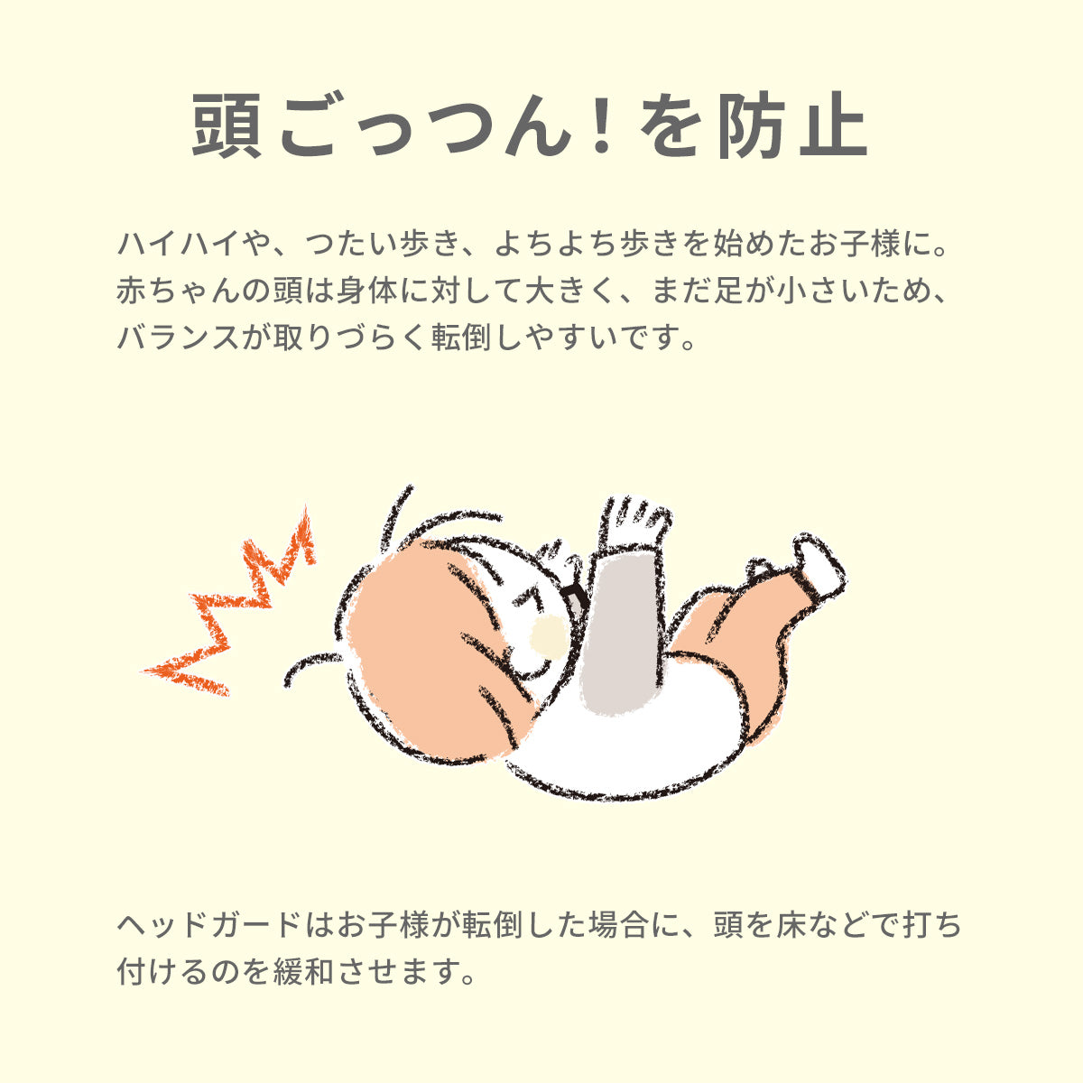 ハイハイや、つたい歩き、よちよち歩きを始めたお子様に。赤ちゃんの頭は身体に対して大きく、まだ足が小さいため、バランスが取りづらく転倒しやすいです。