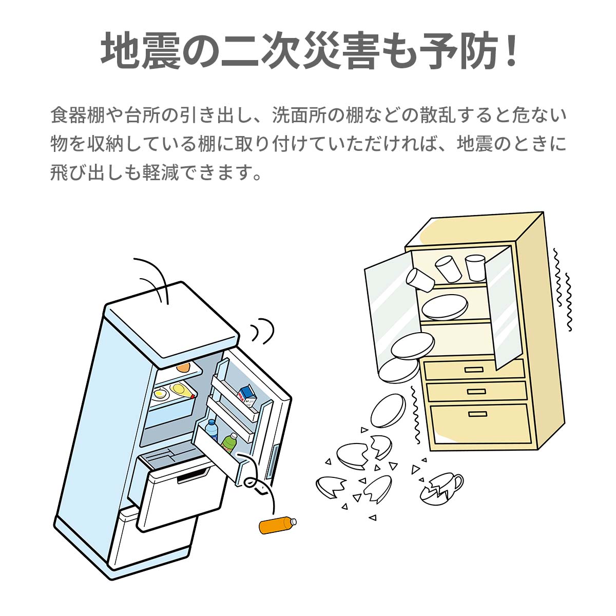 食器棚や台所の引き出し洗面所の棚など散乱すると危ない物を収納している棚に取り付けていただければ地震のときに飛び出しも軽減できる!