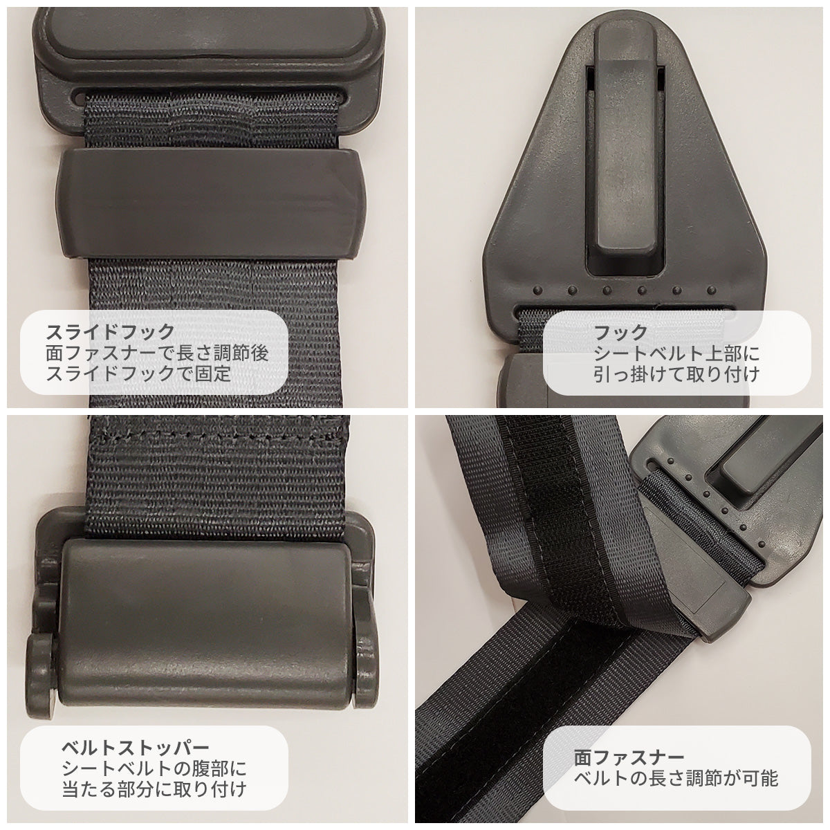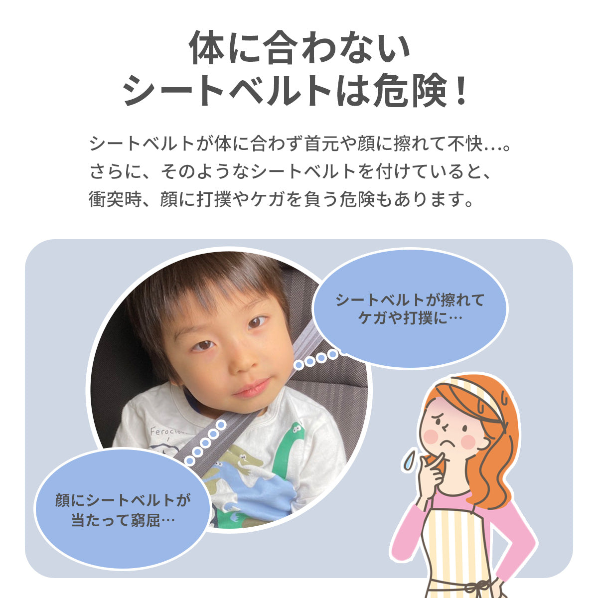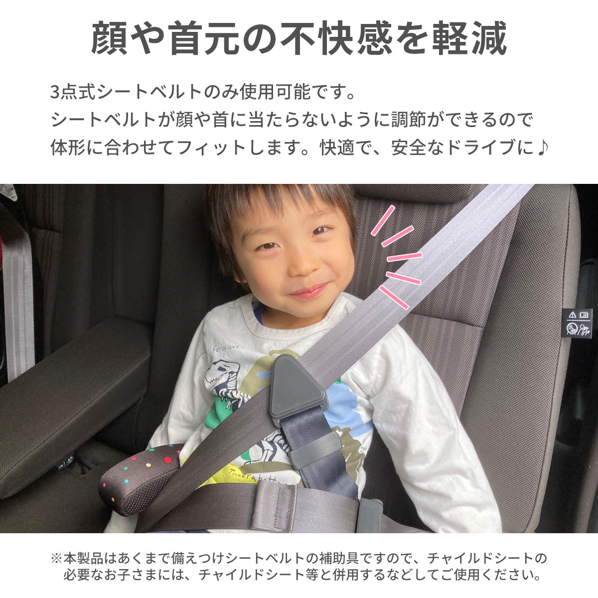 ・本製品はあくまで備えつけシートベルトの補助具ですので、道路交通法により定められたチャイルドシートの必要な6歳未満のお子さまにはチャイルドシート等と併用するなどしてご使用ください。