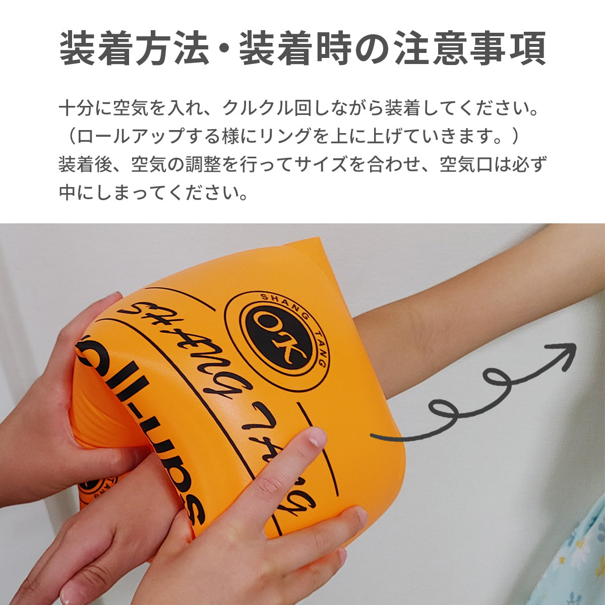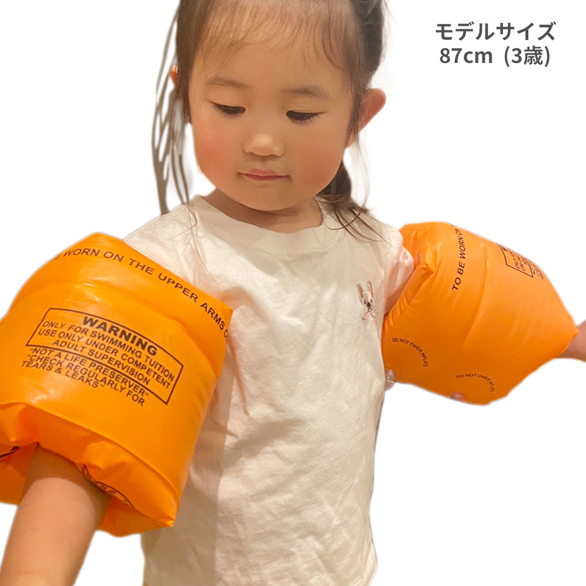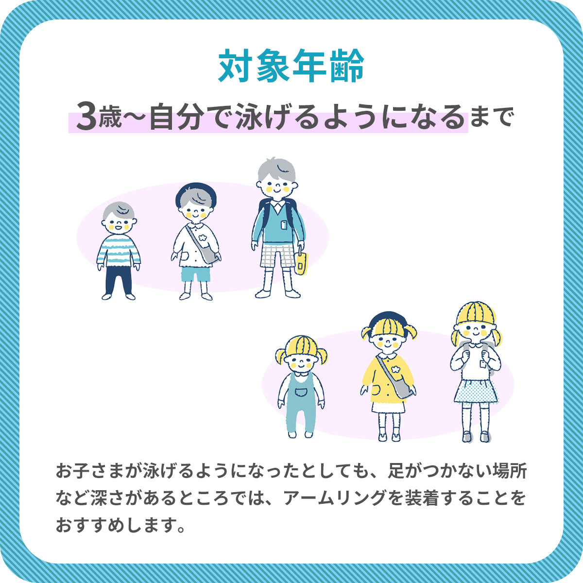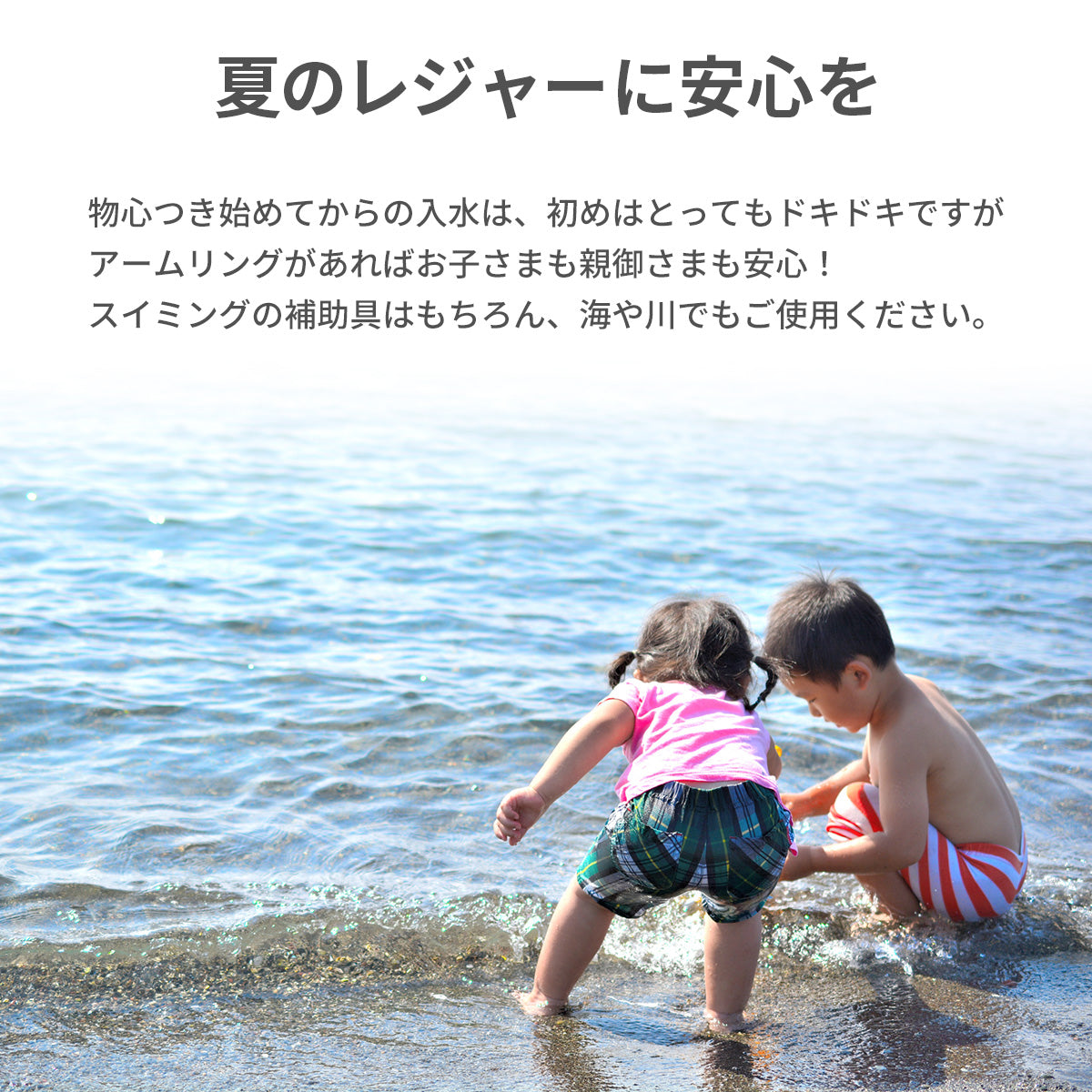ご注意事項 お子さまが泳げるようになったとしても、足がつかない場所など深さがあるところではアームリングを装着することをおすすめします。