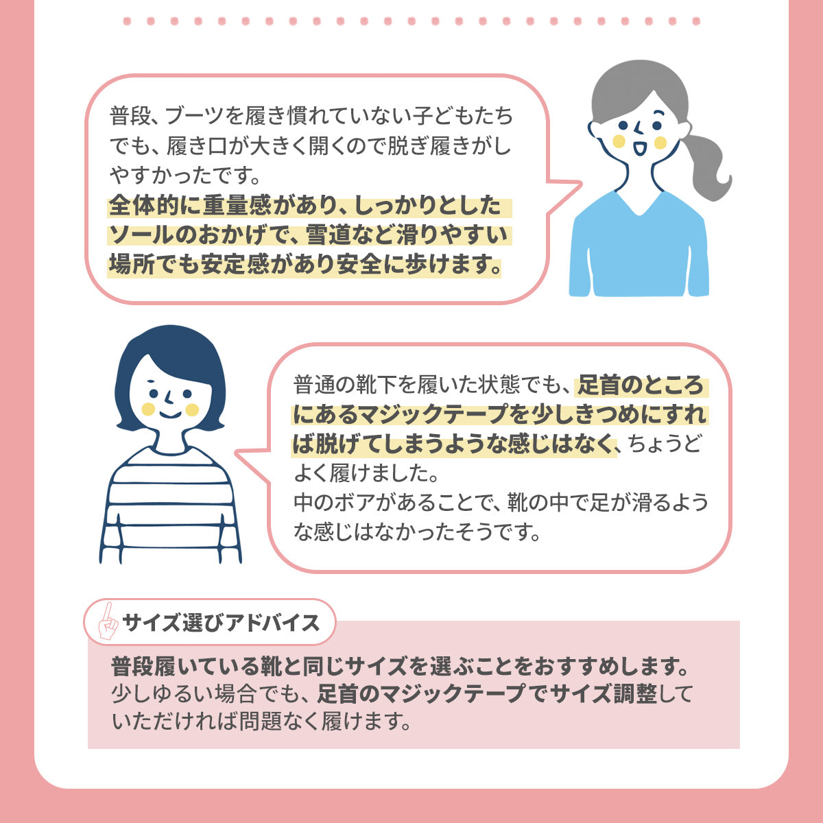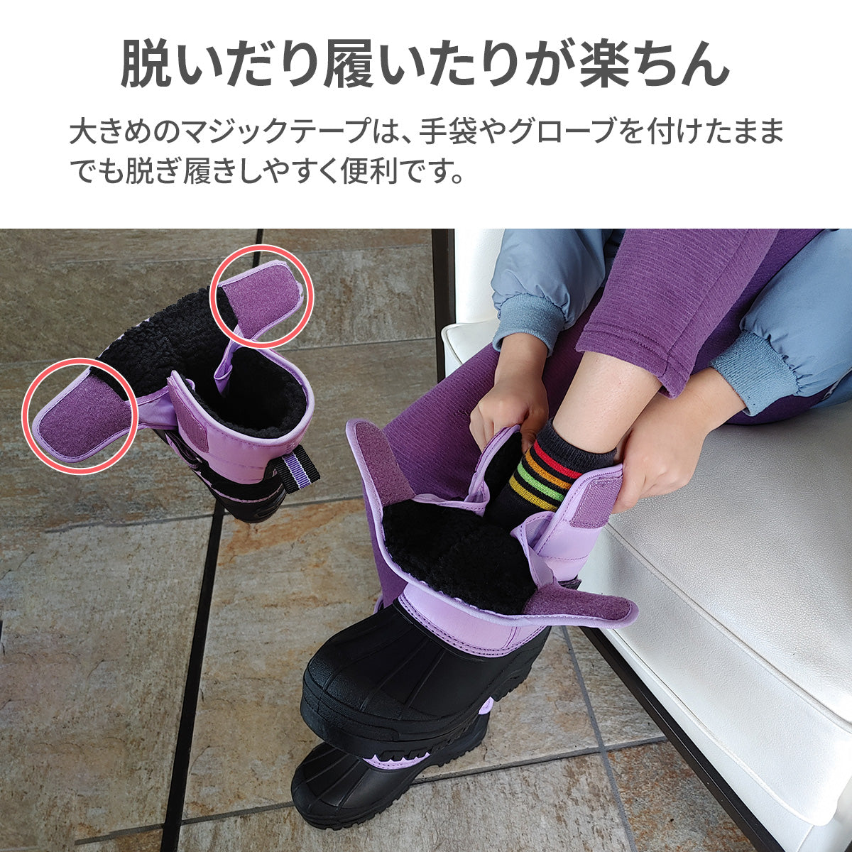 履き口には大きなマジックテープがついており、手袋やグローブを付けたままでも脱ぎ履きができてとっても便利!!