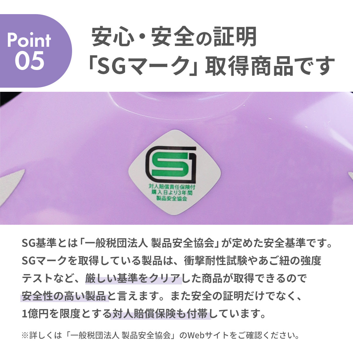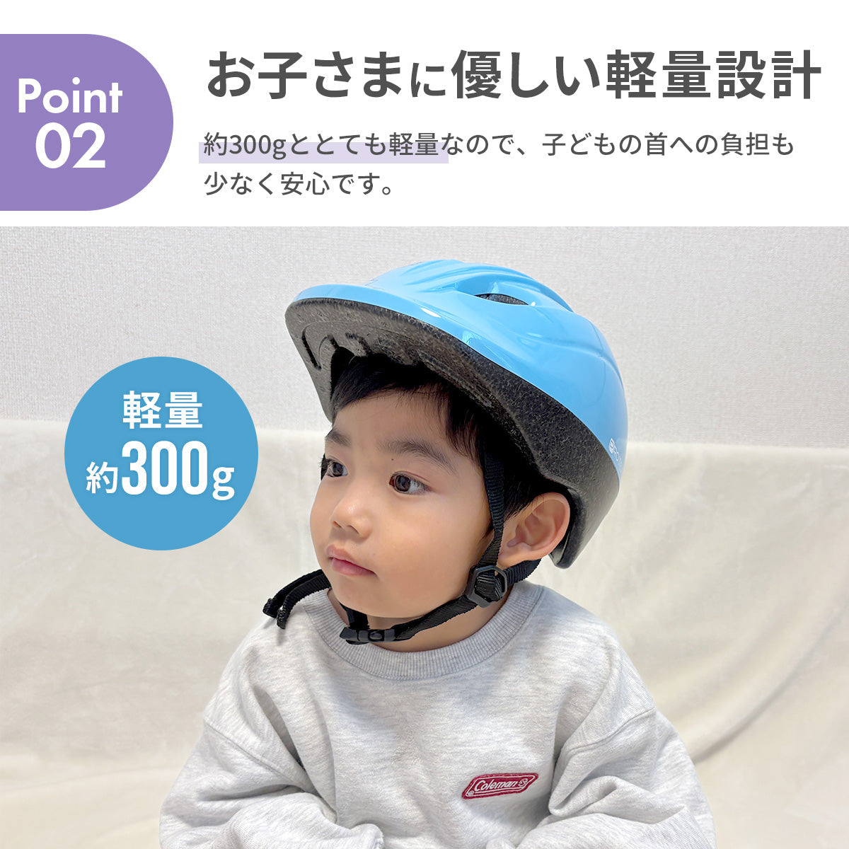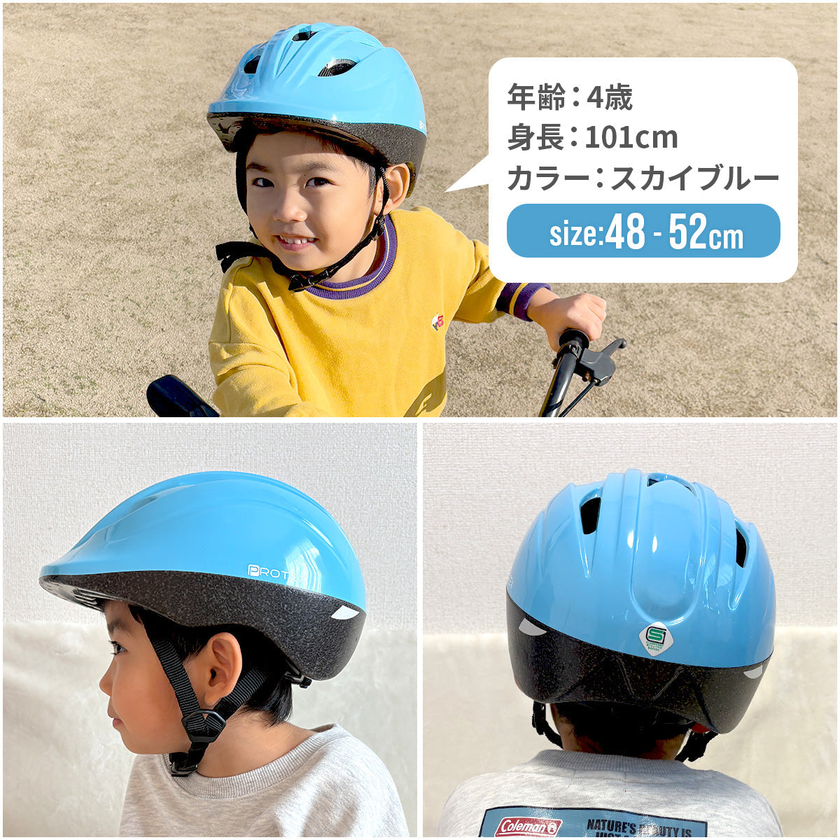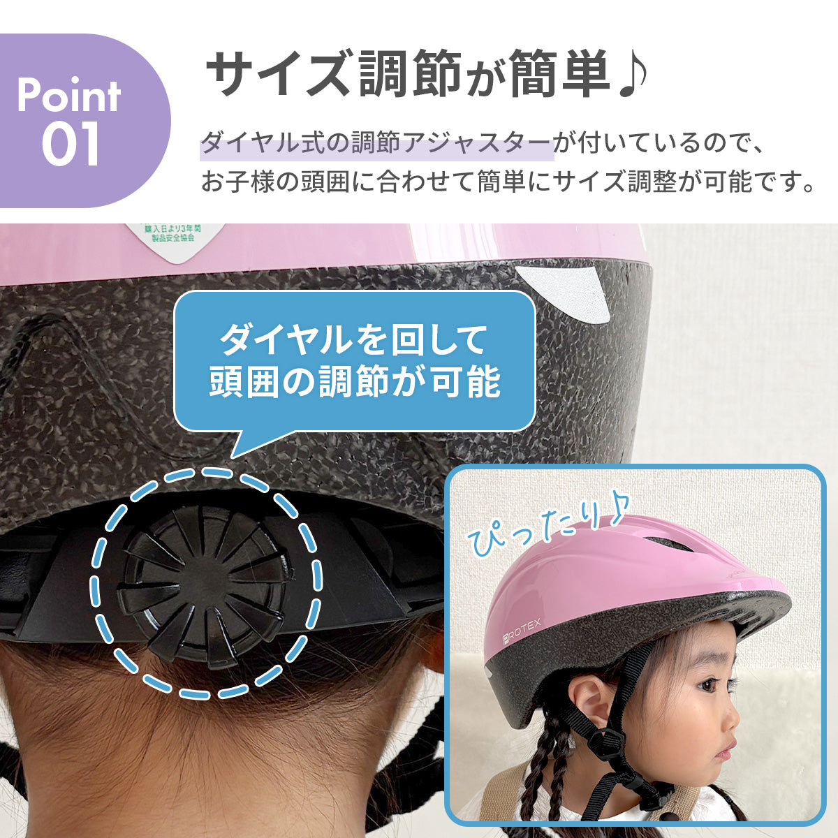 PROTEXのキッズヘルメットは、子どもたちの安全を第一に考えた設計です。ダイヤル式アジャスターによりサイズ調整が簡単で、フィット感を調整できます!約300gの軽量設計で、幼児から小学生頃まで快適に使用可能です。大きな通気孔が蒸れを防ぎ、反射シールが夜間の安全を確保します。SGマークを取得しており、信頼性も抜群です。豊富なカラー展開で、おしゃれなデザインも魅力なヘルメットです♪