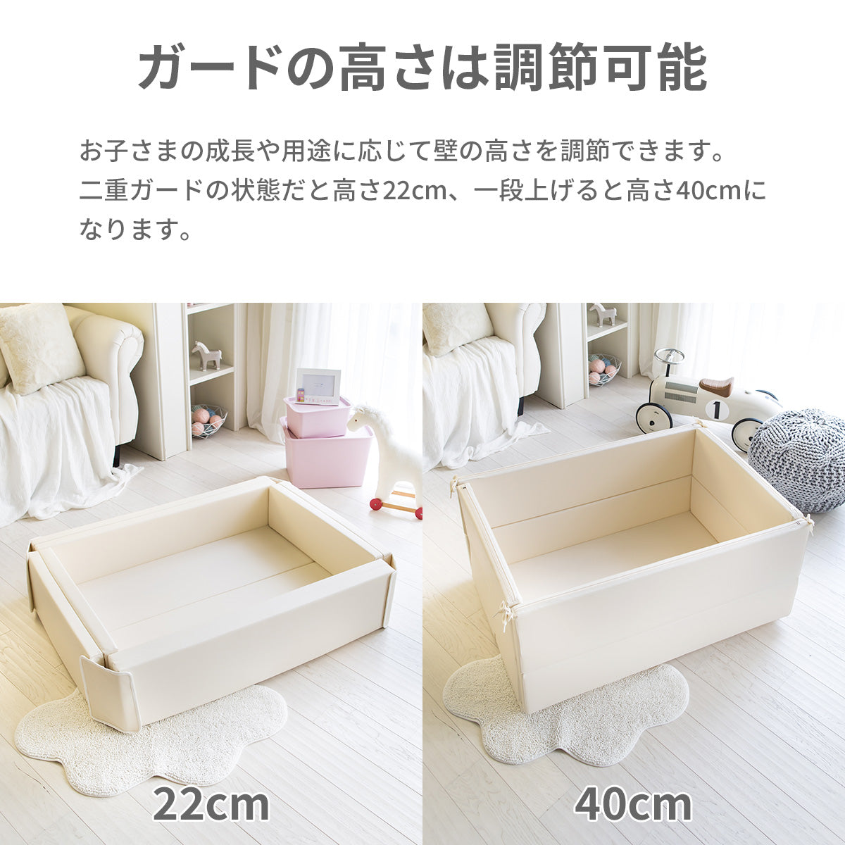 ねんねの時期はベビーベッドとして、おすわりやずりばいの時期にはベビーサークル、お子様の居場所をしっかり囲いたい時はガードを高くしたベビールームに!!