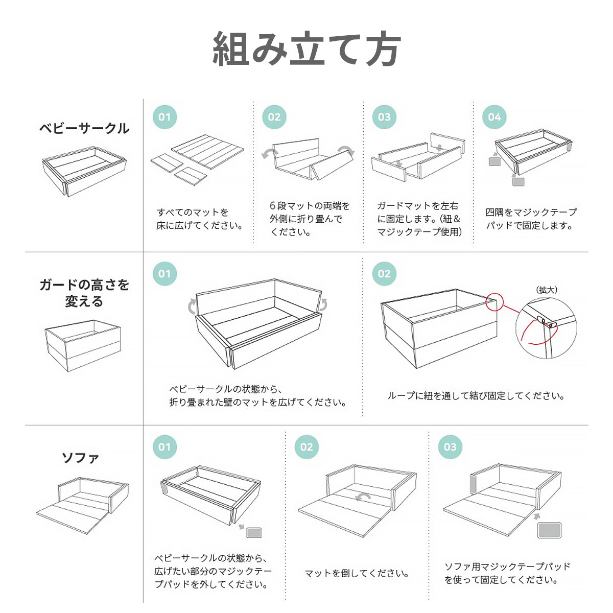 マットを片面広げれば大人でも横になれるソファーになったり、サークルとして使わなくなったら床に敷くプレイマットとして歩き始めのけが防止や足音の騒音対策にも役立ちます!