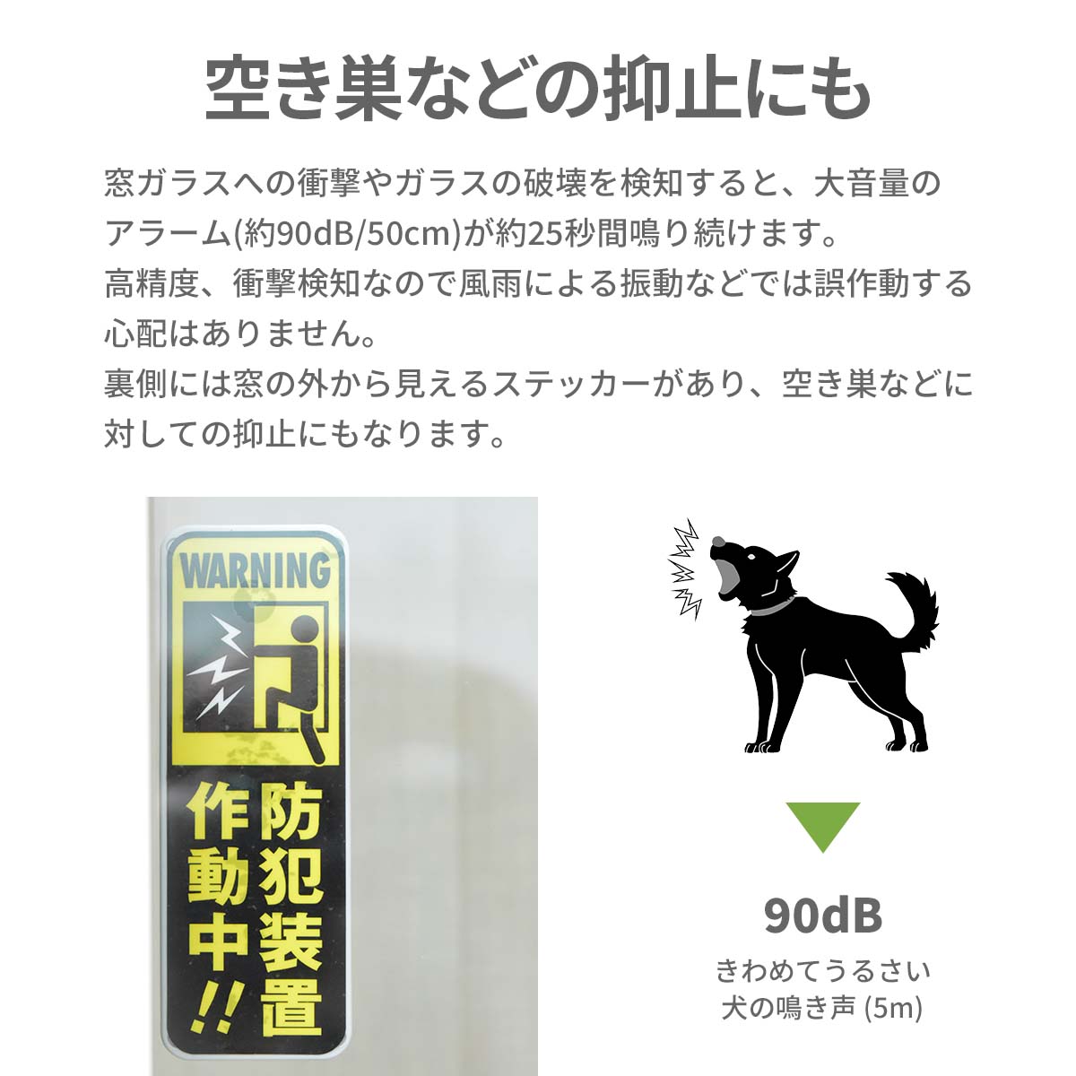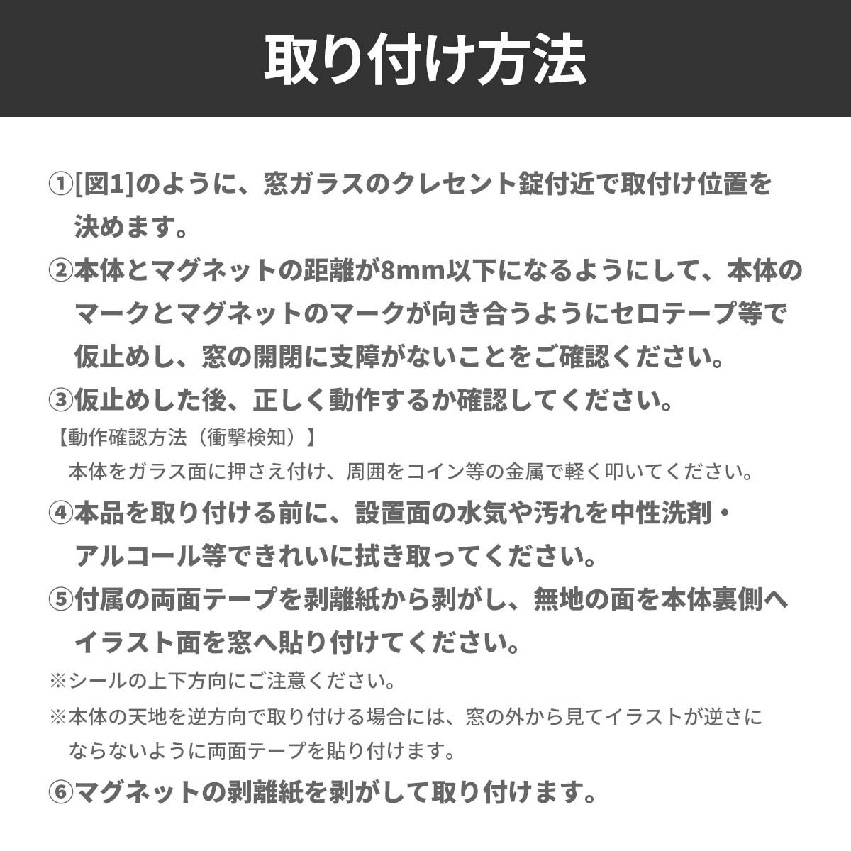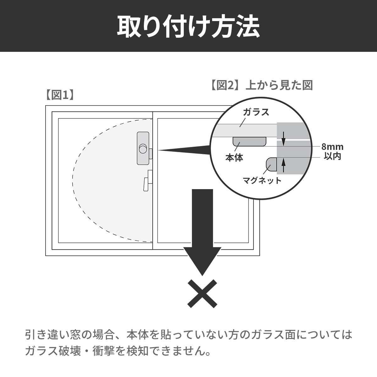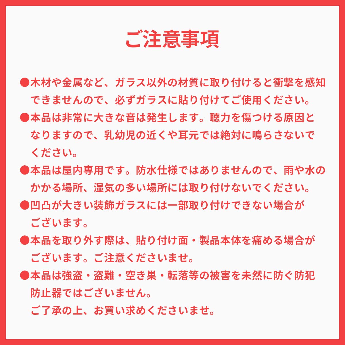 ●木材や金属など、ガラス以外の材質に取り付けると衝撃を感知できませんので、必ずガラスに貼り付けてご使用ください。