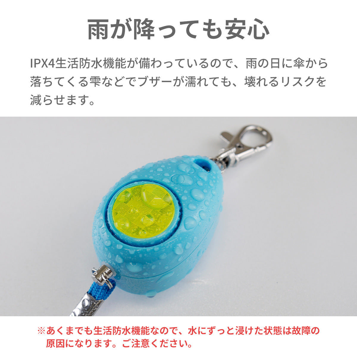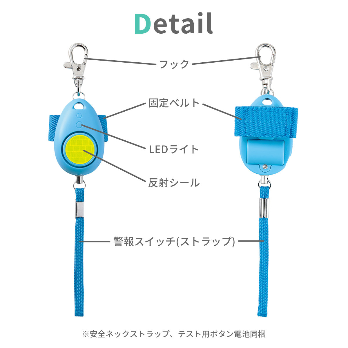 仕様 | ストラップを引っ張ると警報音と同時にLEDライトが点滅 |