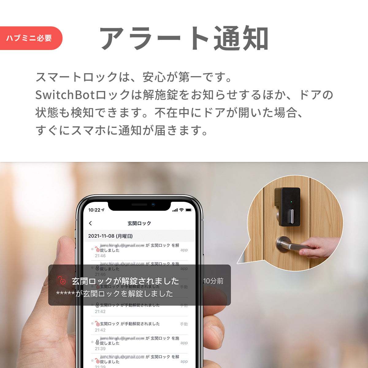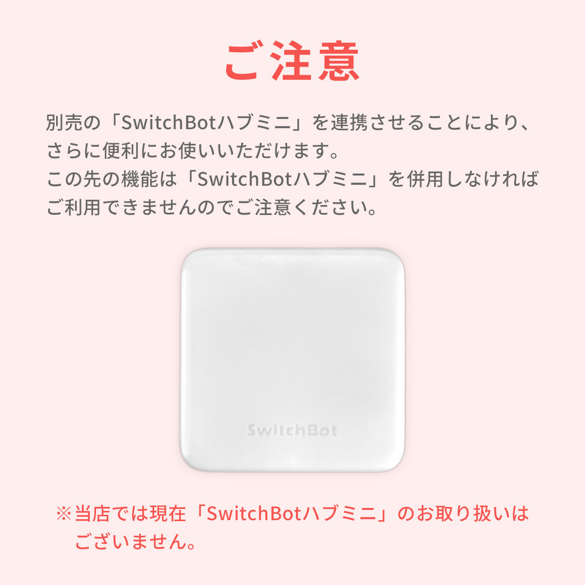 ・遠隔操作、通知受信またはサードパーティーサービスを利用したい場合、「SwitchBotハブミニ」との併用が必要です。