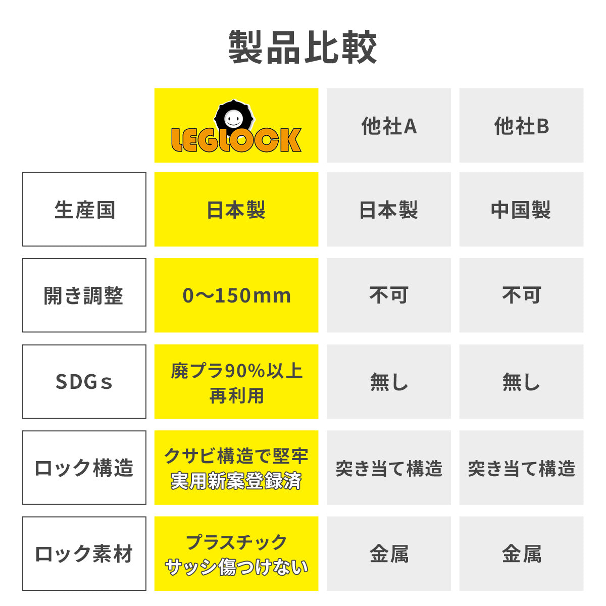 クサビ形ロック構造(実用新案登録済)により、金属に劣らない強度を実現。子どもの窓からの転落や、いたずら防止にも最適です。