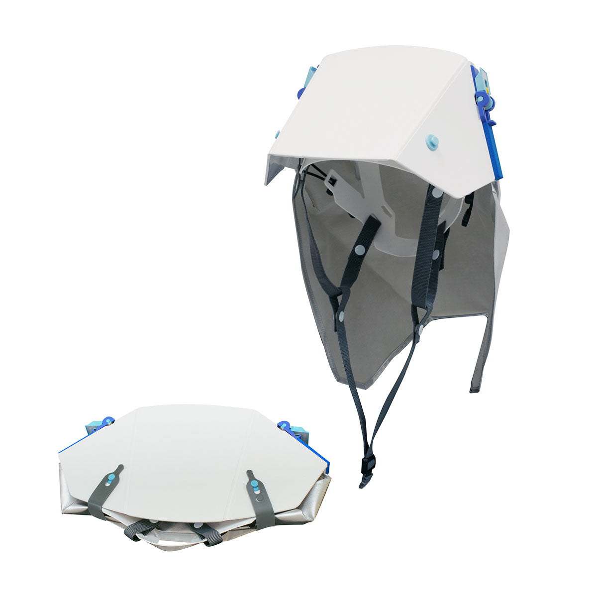 タタメットズキン3は、折りたたみ式ヘルメットと防災ずきんが一体化した次世代型防災ずきんです。ヘルメット部が落下物に対応し、防災ずきん部が火の粉や熱に対応します。