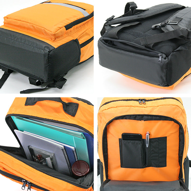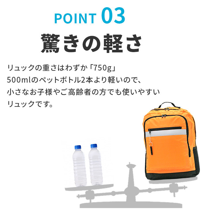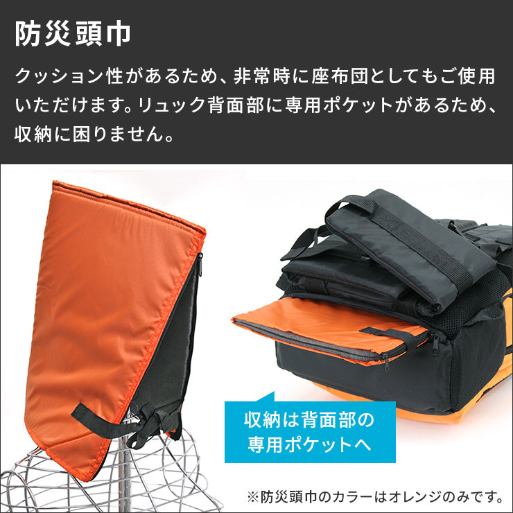クッション性があるため、非常時に座布団としてもご使用いただけます。リュック背面部に専用ポケットがあるため、収納に困りません。※防災頭巾のカラーはオレンジのみです。