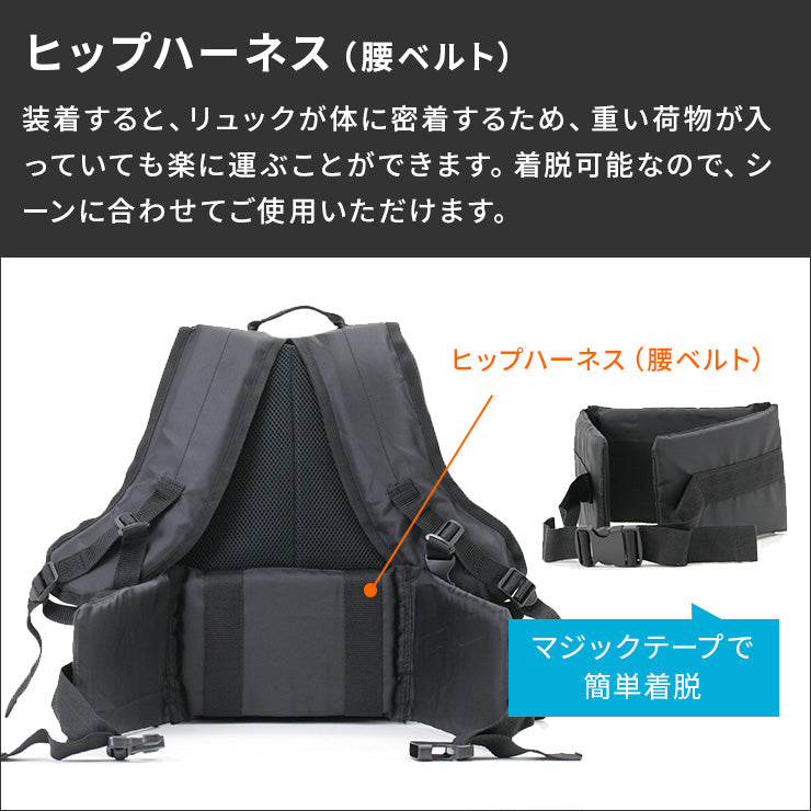 装着すると、リュックが体に密着するため、重い荷物が入っていても楽に運ぶことができます。着脱可能なので、シーンに合わせてご使用いただけます。