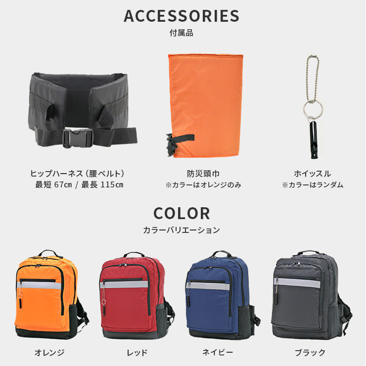 セット内容 | リュックサック、防災頭巾 (オレンジ)、ホイッスル(※カラーは選べません) |