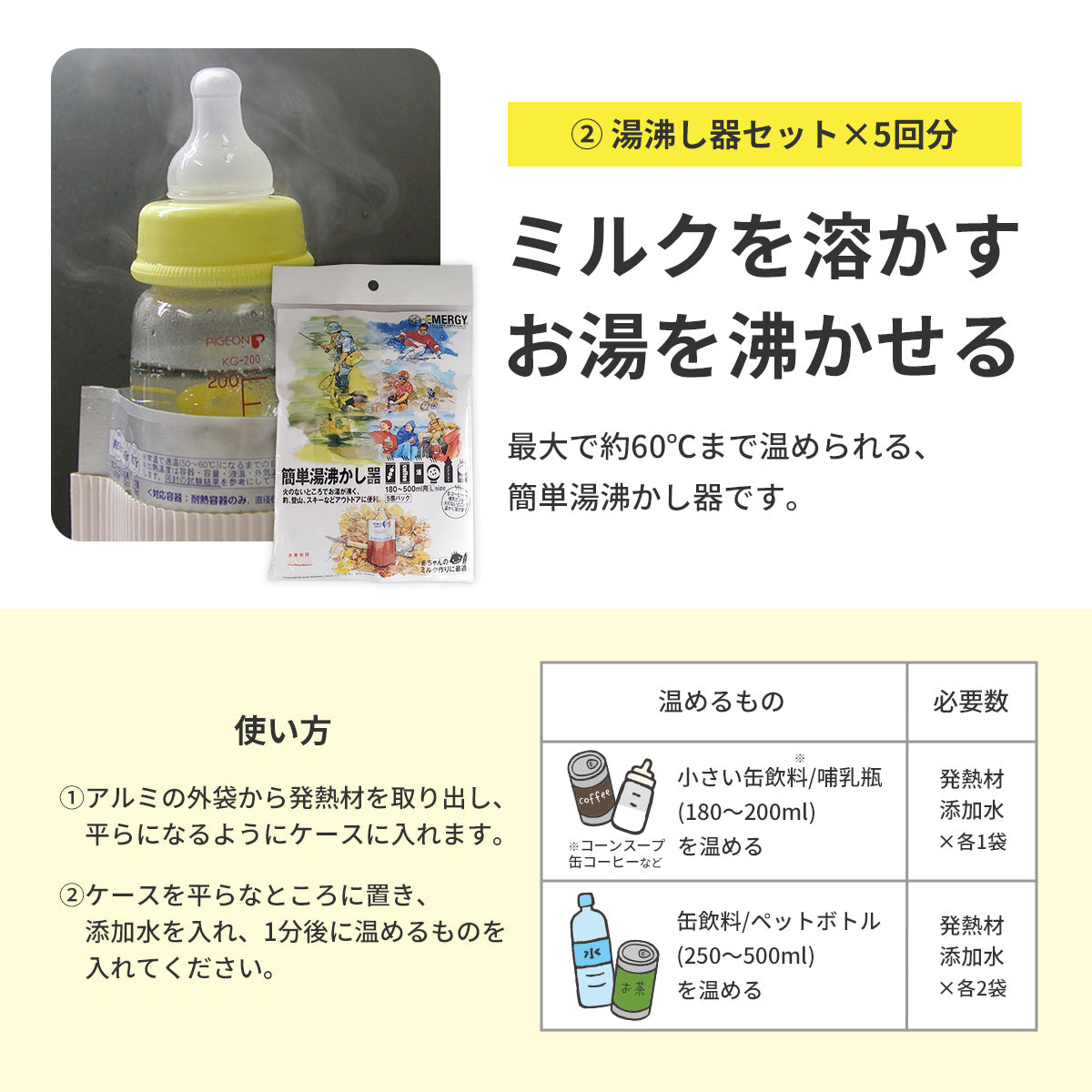 ② 湯沸し器セット | [素材]生石灰、アルミ [サイズ]本体サイズ:約13.5cm×15cm [内容物]発熱剤10g、添加水20ml=1回分×5 [保存期間]有効期限5年 |