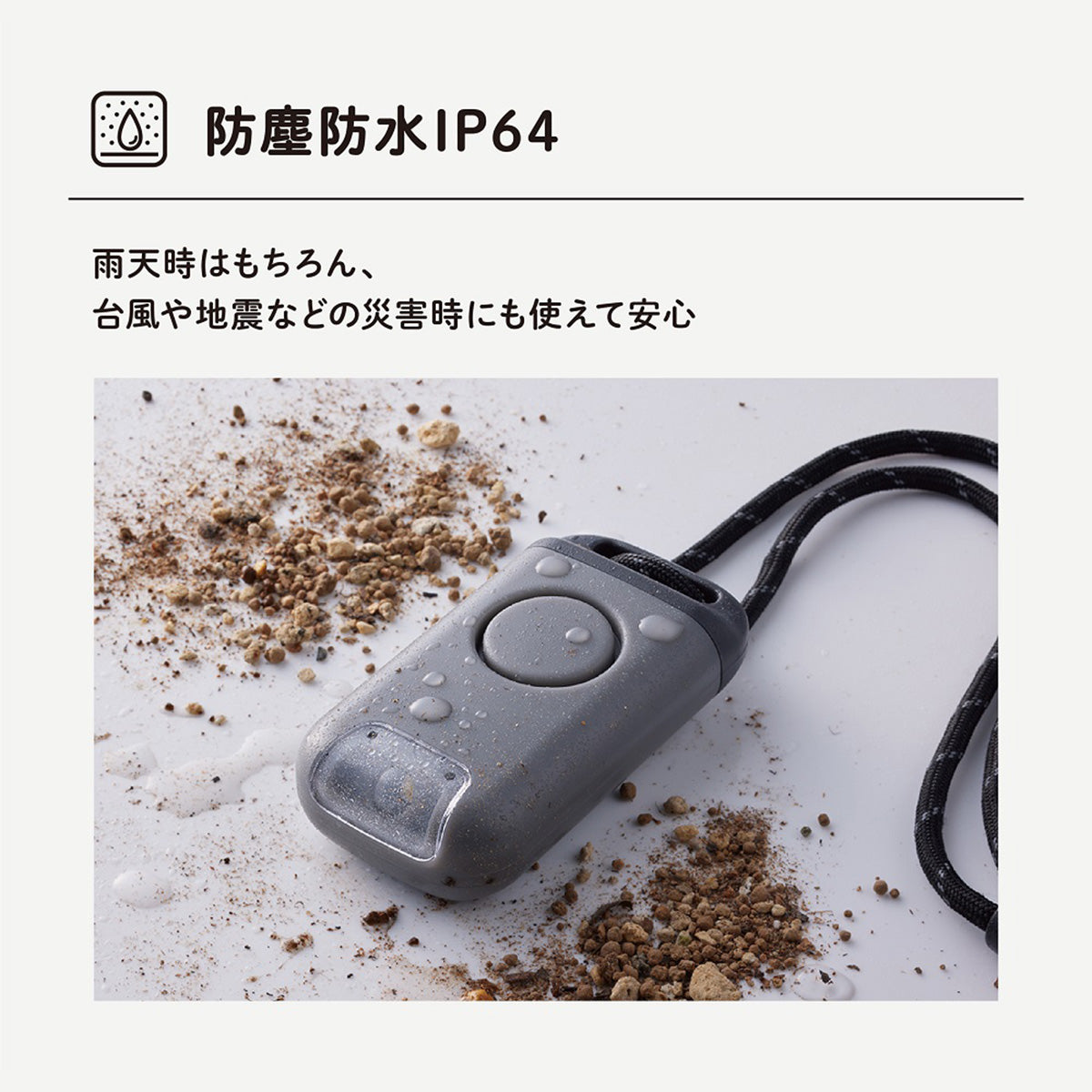 ・雨天時などで携帯しても内部に水の侵入はありませんが、警報音を鳴らした場合は内部に水が侵入し、音量が低下する場合があります。