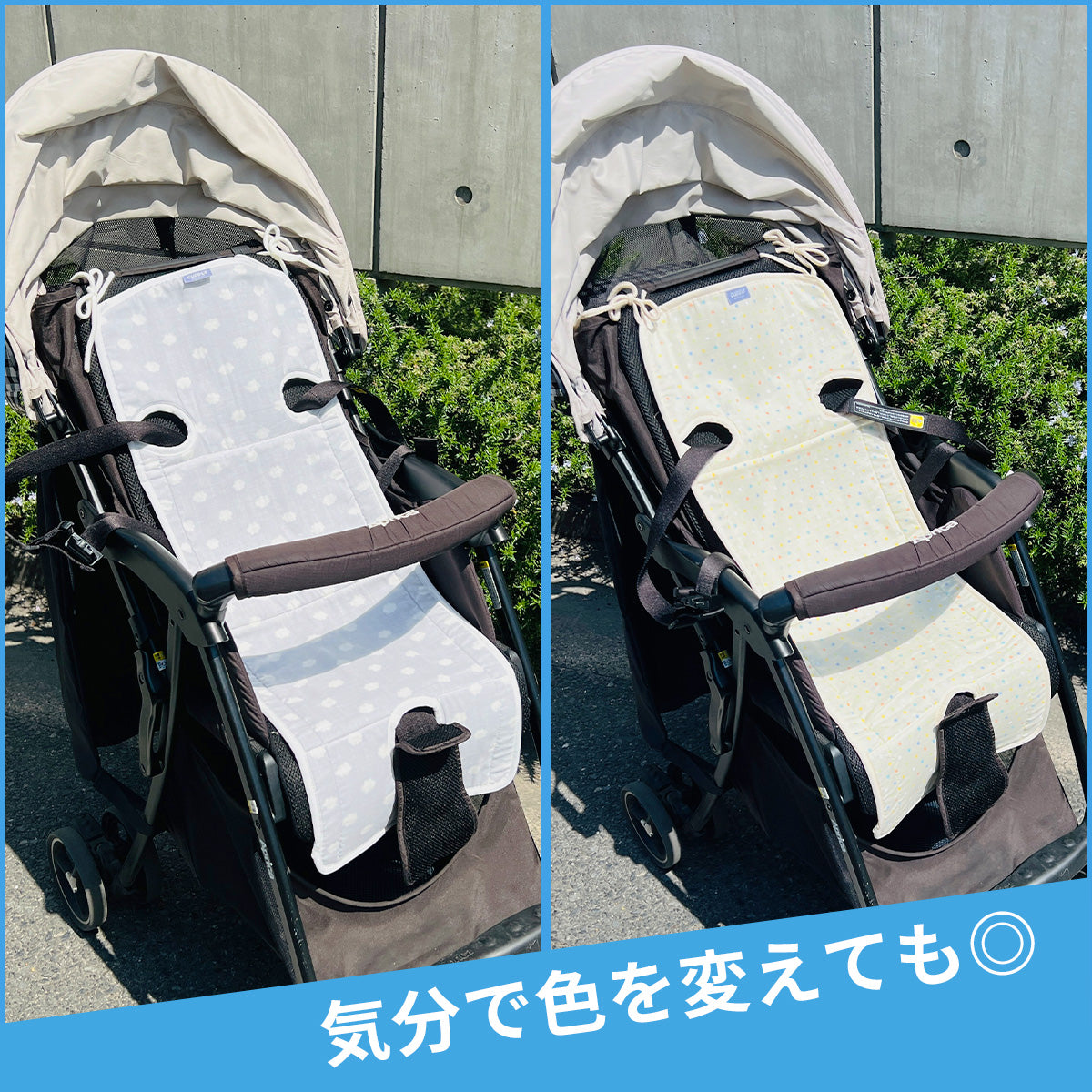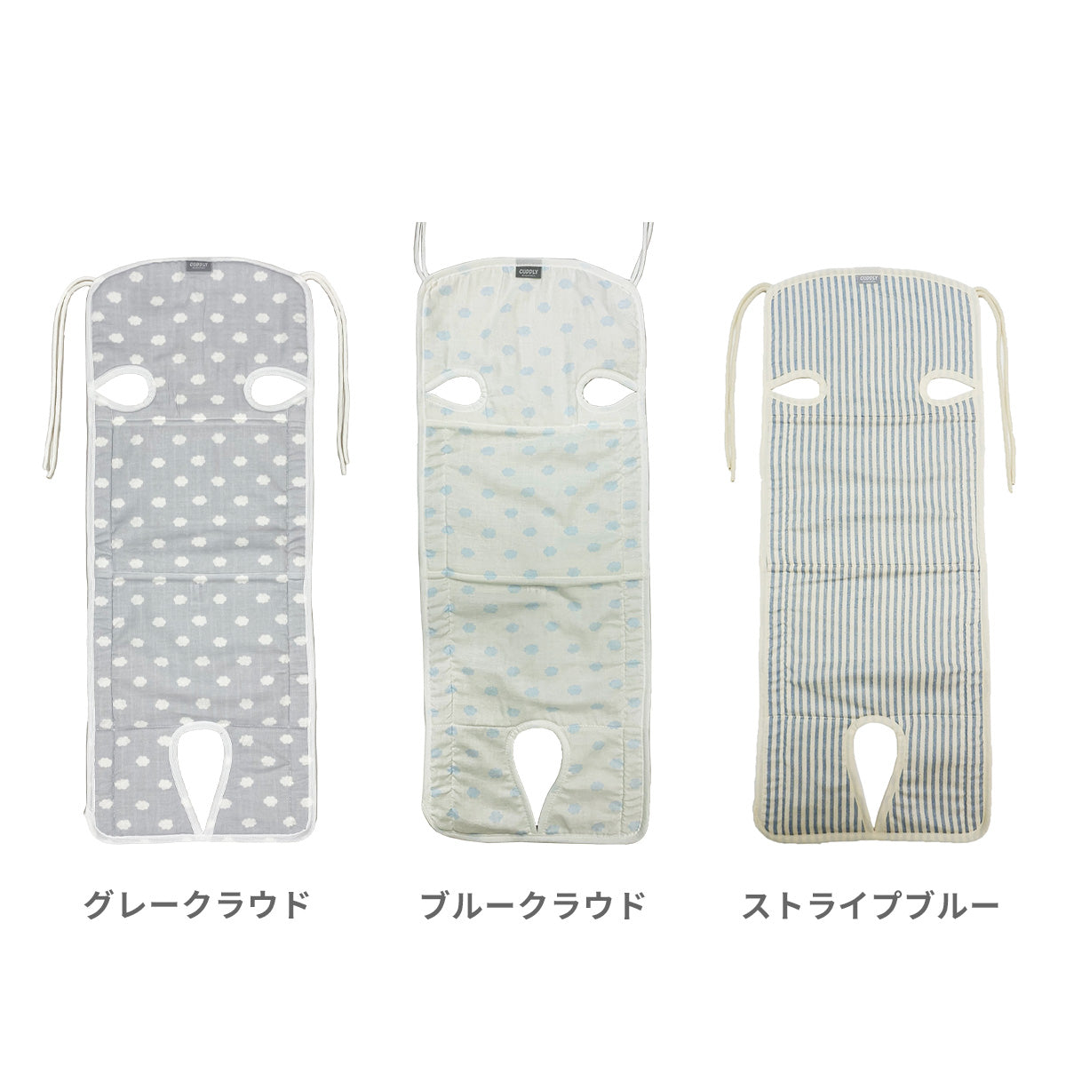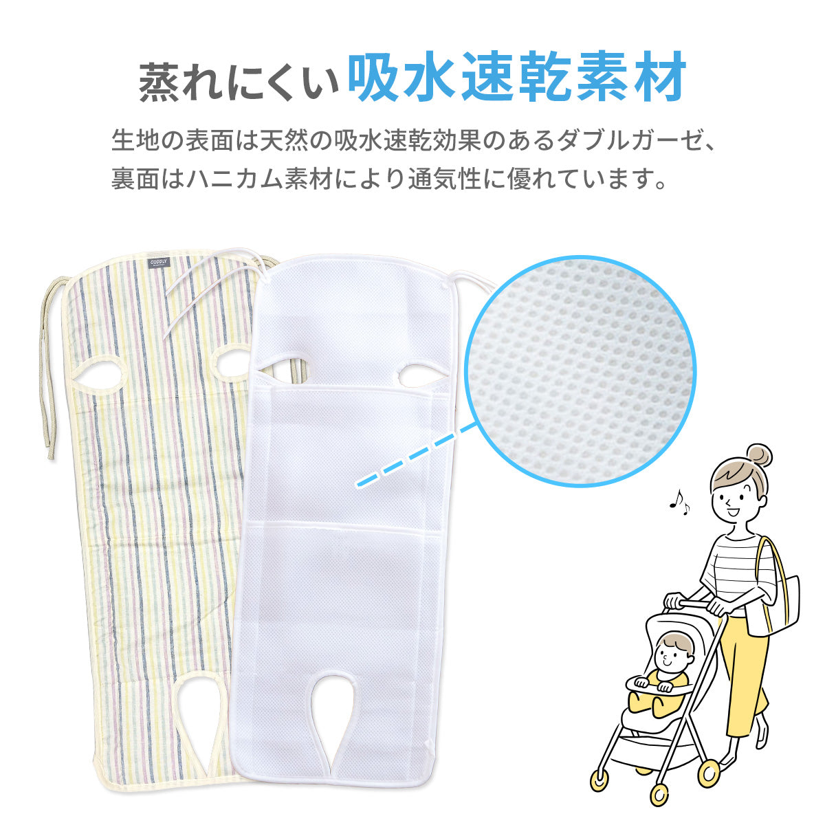 ダブルガーゼで肌触りがサラサラ。天然の吸水速乾作用で汗をかいてもすぐに乾きべたつきません。裏地のハニカム素材も通気性バツグンです。フリーなベルトホールがあるので3点式・5点式のベビーカーに対応しています。取り付けはストラップを結ぶだけなので、様々なベビーカーに簡単に取り付けられます。