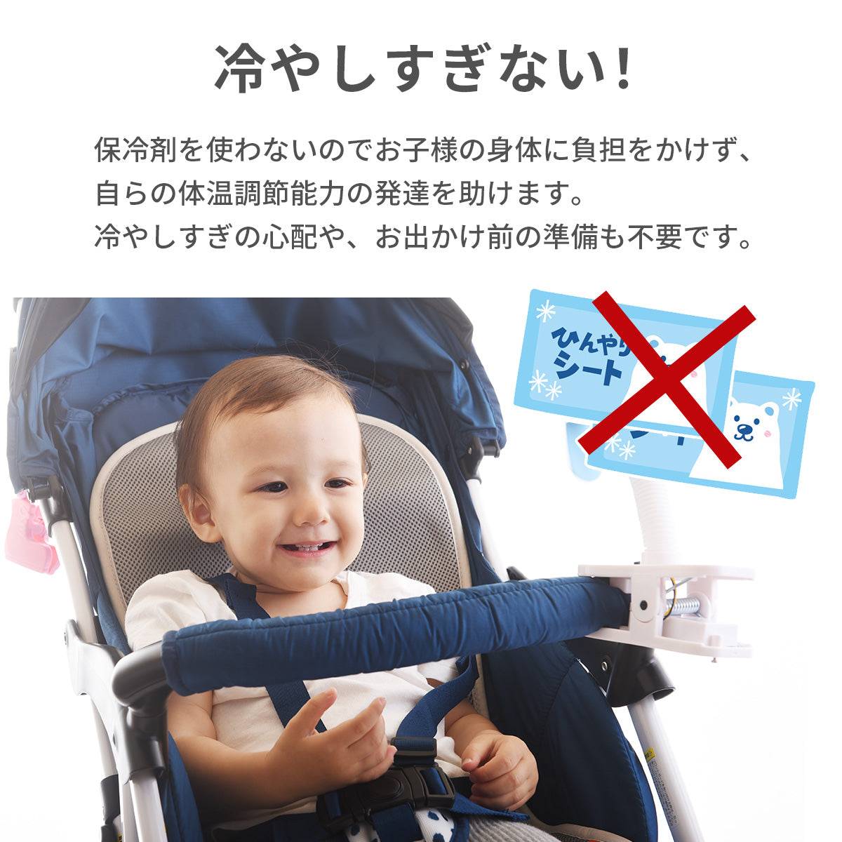 保冷剤を使わないのでお子様の身体に負担をかけず、自らの体温調節能力の発達を助けます!