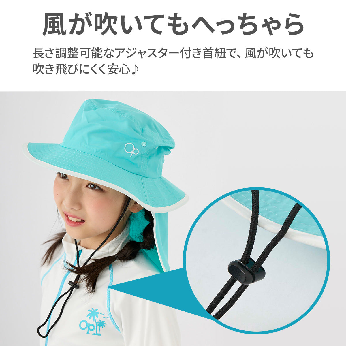 外で走り回っても脱げにくいように、アジャスター付きの首紐で調節◎!
