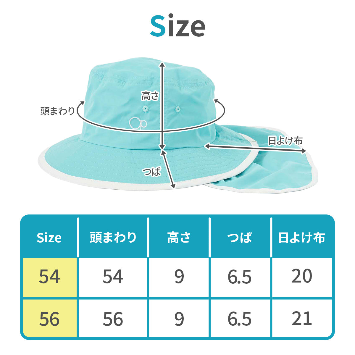 56:頭囲56cm・つば6.5cm・日よけ縦21cm x 横34cm