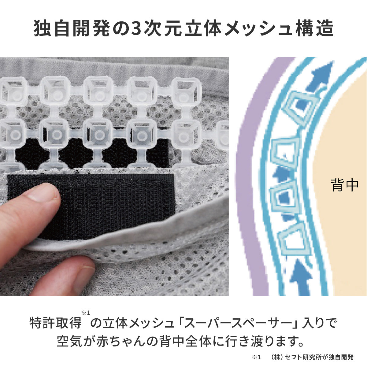 お子様の背中とカバーの間に風を送り込み、効率的に汗を蒸発させ気化熱で身体を冷やすというすごい機能!!