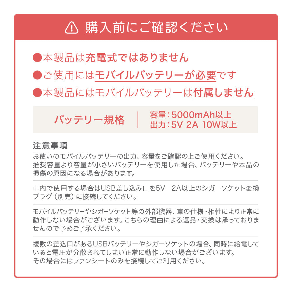●複数の差込口があるUSBバッテリーやシガーソケットの場合、同時に給電していると電圧が分散されてしまい正常に動作しない場合がございます。その場合にはファンシートのみを接続してご利用ください。
