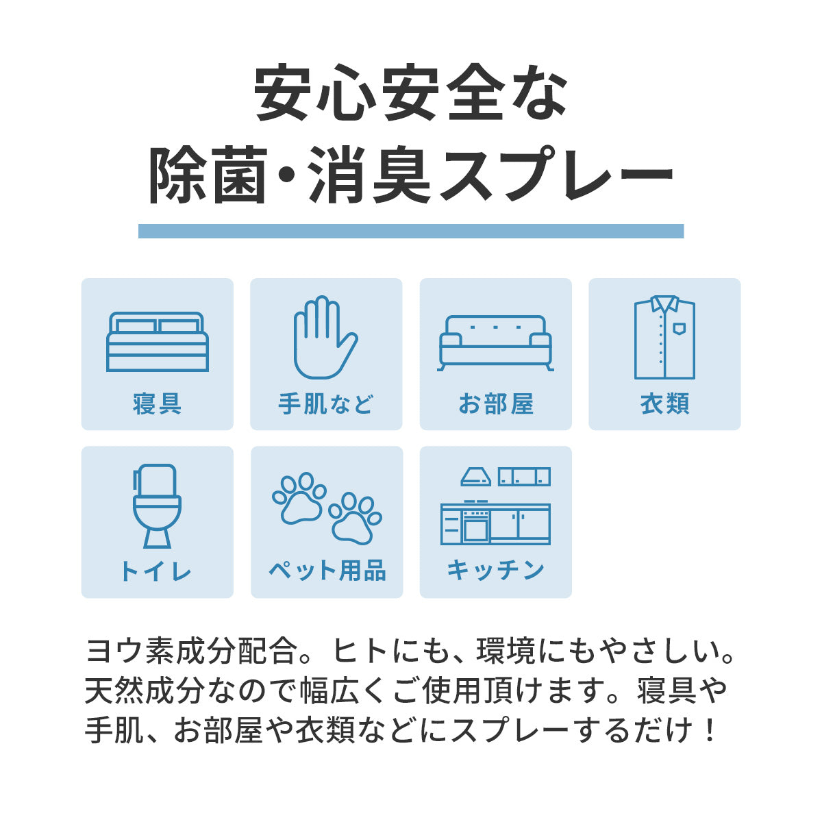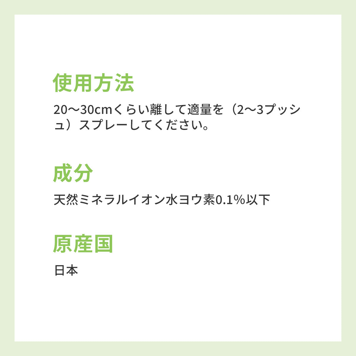 ヨウ素成分配合のヒトにも環境にもやさしい、安心安全な除菌・消臭スプレー! 天然成分なので幅広くご使用頂けます。寝具や手肌、お部屋や衣類などにスプレーするだけ! ●使用方法 20~30mくらい離して適量を(2~3プッシュ)スプレーしてください。 ●成分 天然ミネラルイオン水ヨウ素0.1%以下