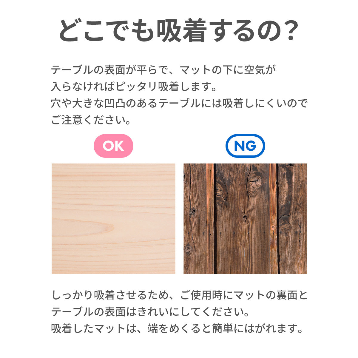 ・穴や大きな凹凸のあるテーブルでは、ezpzの吸着力は期待できません。ご使用時にマットの裏面とテーブルの表面は、必ず綺麗にしてください。吸着したマットは、端をめくれば簡単にはがれます。