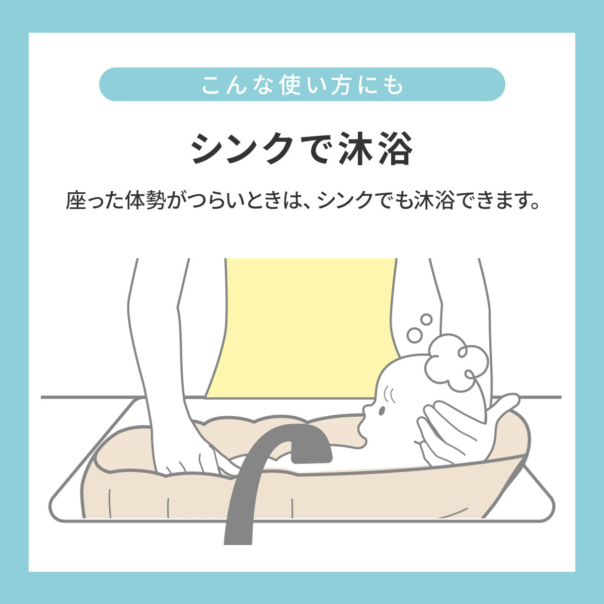 また、シンクでも使用できるので、ママパパがしゃがまずに立って沐浴できます!