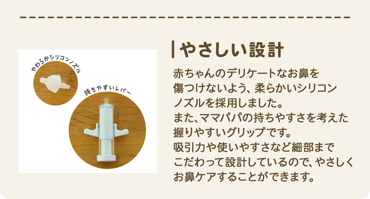 レバーを鼻孔に当ててレバーを引くだけの簡単操作で、鼻水がしっかり吸引!
