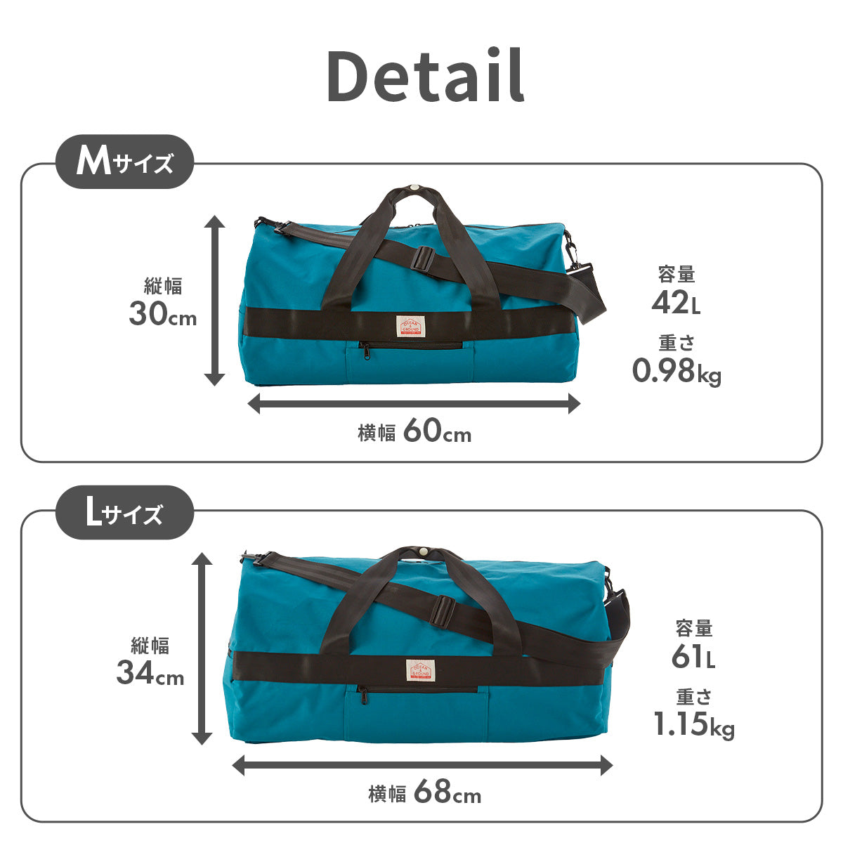 サイズ | M(本体総丈:30cm 本体巾:60cm 容量:42L 質量:0.98kg) L(本体総丈:34cm 本体巾:68cm 容量:61L 質量:1.15kg) |