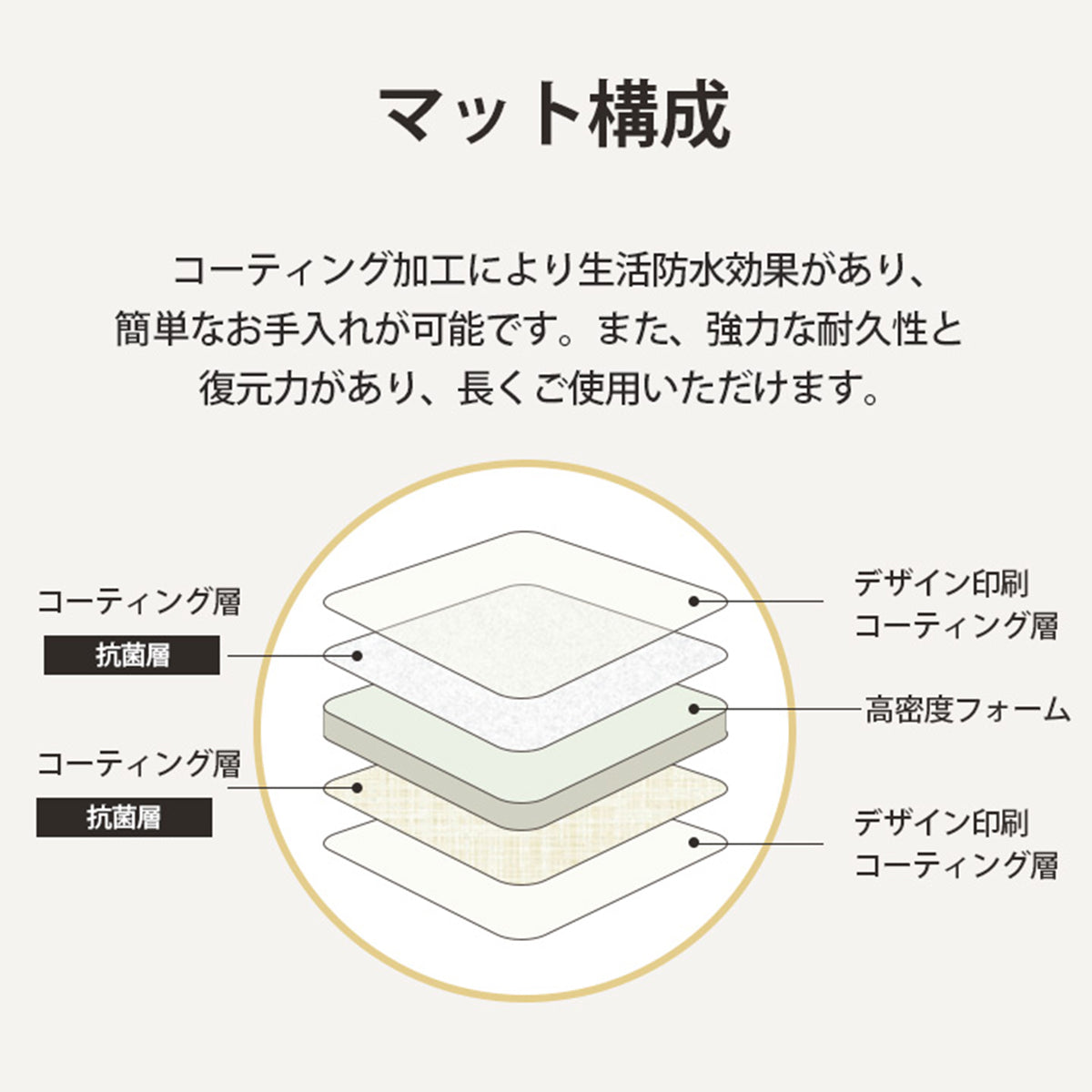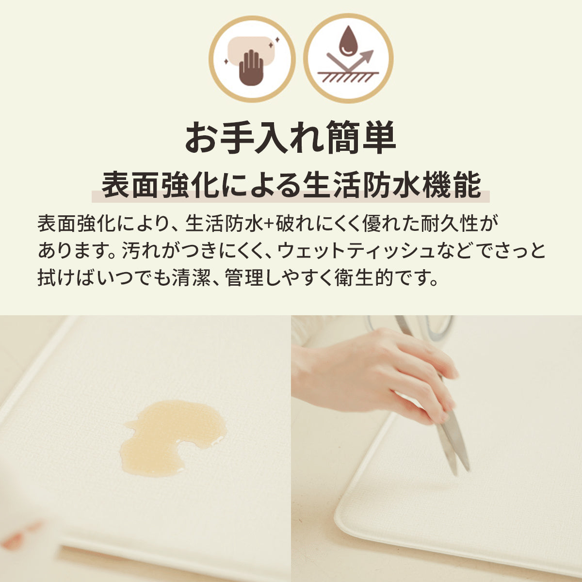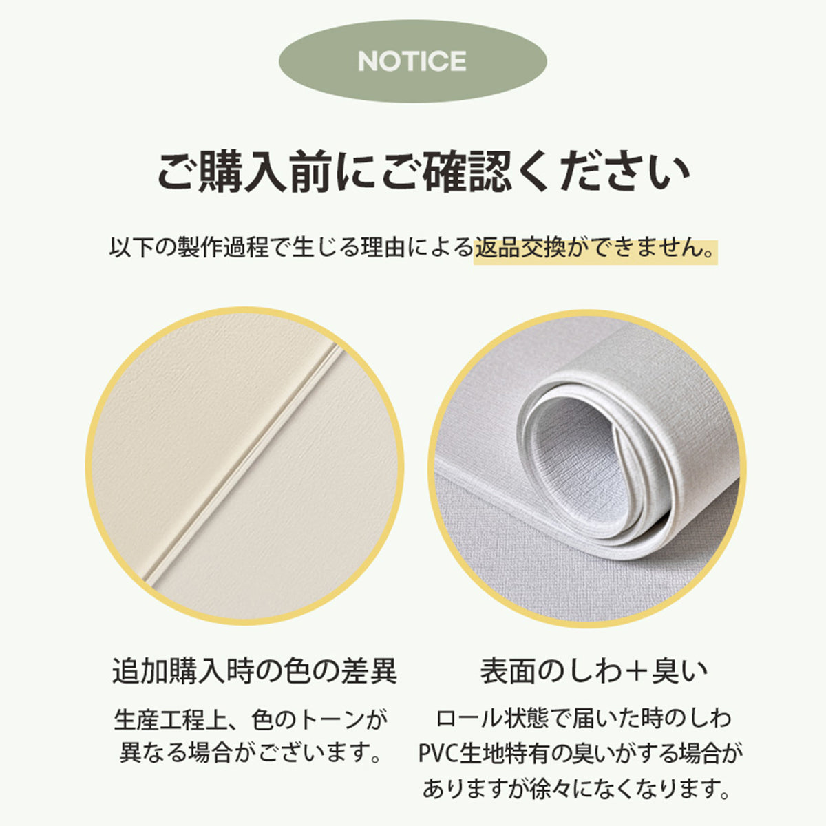ご使用時の注意事項 | ・変形の恐れがあるため、直射日光や高温になる物の近くで使用しないでください。 ・家具などを長時間置いた場合、マットがくぼみ完全に戻らなくなる場合がございますのでご注意下さい。 ・洗濯機の使用や水洗いは変形の恐れがあります。表面が汚れた場合は、ウエットティッシュや濡らした布などで拭き取ってください ・油性ペン、ボールペン、色鉛筆等の汚れは落ちない可能性があります。 ・お手入れに洗剤を使用しないでください。 ・色落ちしやすい衣類(デニム等)、コーヒーや果物がマットに移染すると落ちない恐れがあります。 ・定期的にマットを立てて風通しするなどお手入れを行ってください。 |