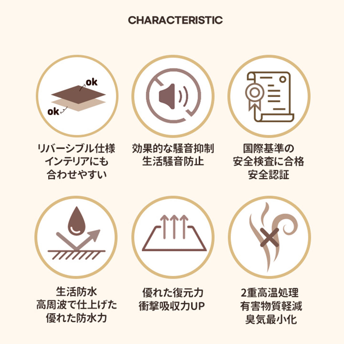 ・高密度エアセルPVCフォームを使用。衝撃吸収と復元力に優れ、転倒時のケガの防止、関節への負担軽減につながります。