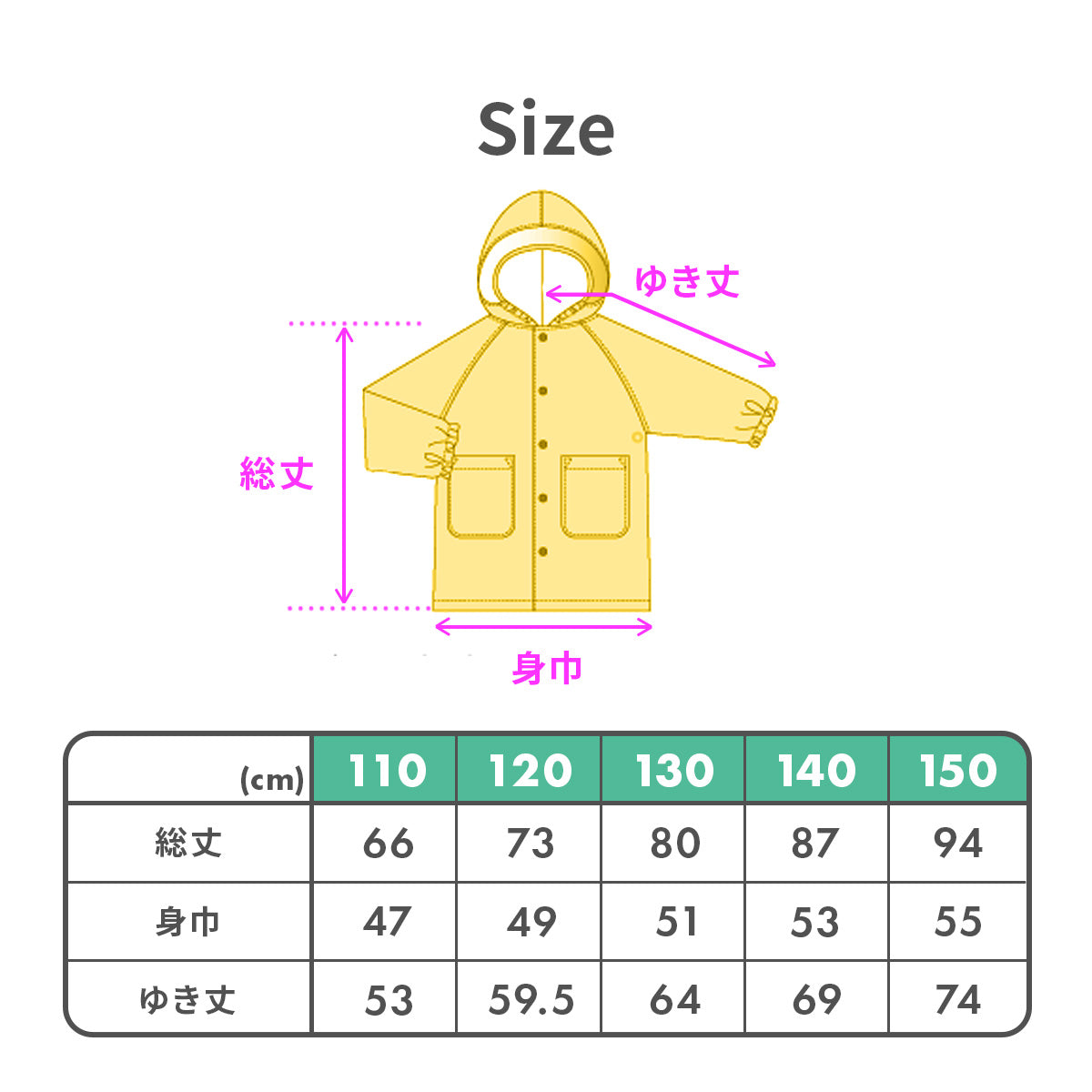 サイズ | 110:総丈66cm・身巾47cm・ゆき丈53cm 120:総丈73cm・身巾49cm・ゆき丈59.5cm 130:総丈80cm・身巾51cm・ゆき丈64cm 140:総丈87cm・身巾53cm・ゆき丈69cm 150:総丈94cm・身巾55cm・ゆき丈74cm |