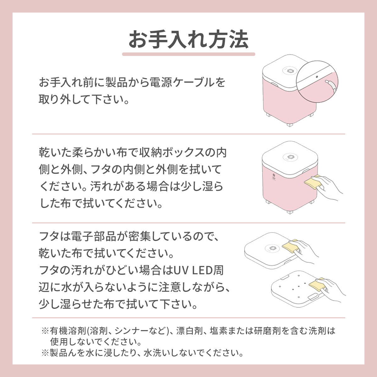 ・蓋の汚れがひどい場合は、UV LED周辺に水が入らないように注意しながら、少し湿らせた布で拭いてください。