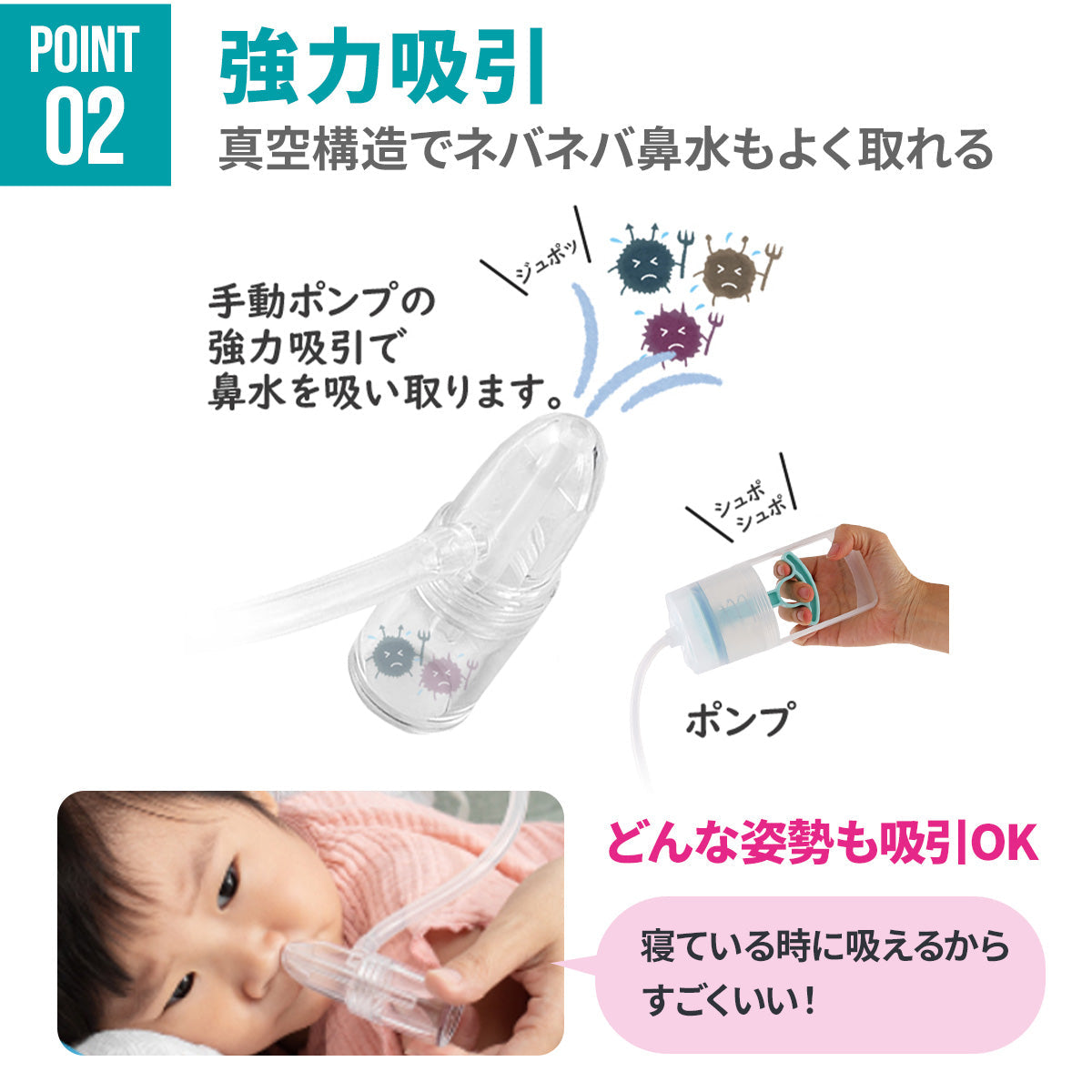寝ている時でも鼻水を一気に吸ってあげられます。