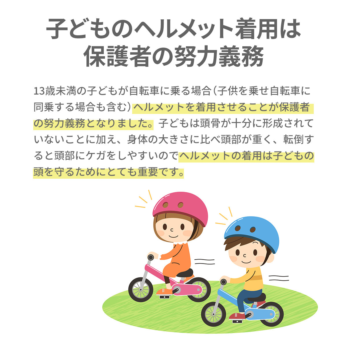 子供は頭骨が十分に形成されていないことに加え、身体の大きさに比べ頭部が重く、転倒すると頭部にケガをしやすいので、ヘルメットの着用は子供の頭を守るためにとても重要です。