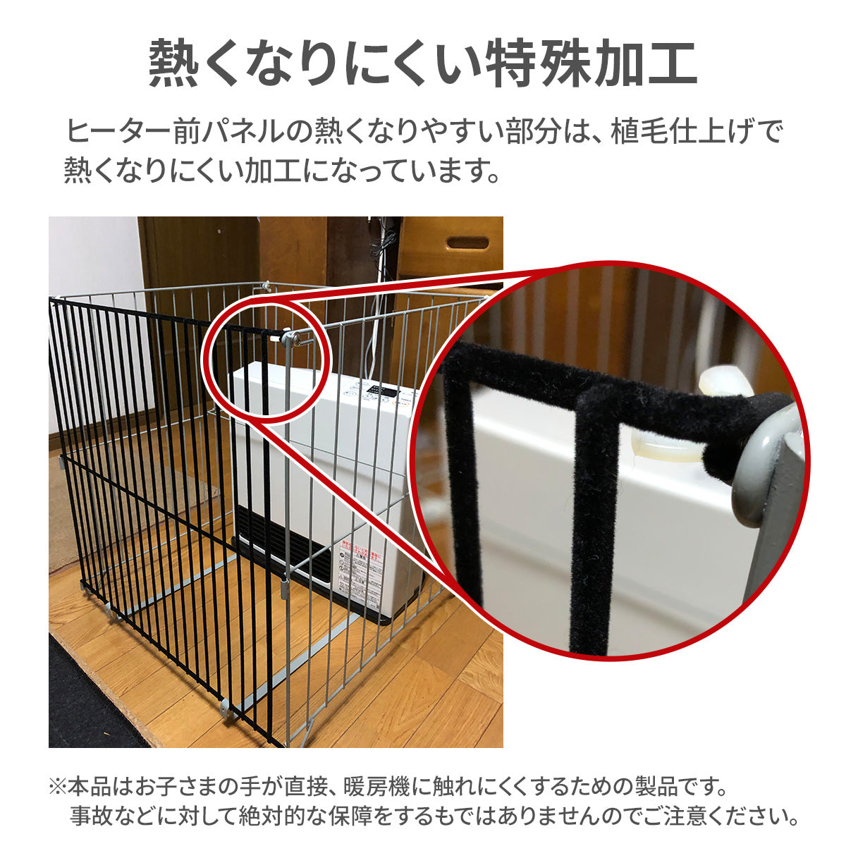 ・本品はお子様の手が直接暖房機に触れにくくするための製品であり、事故などに対して絶対的な保障をするものではありません。