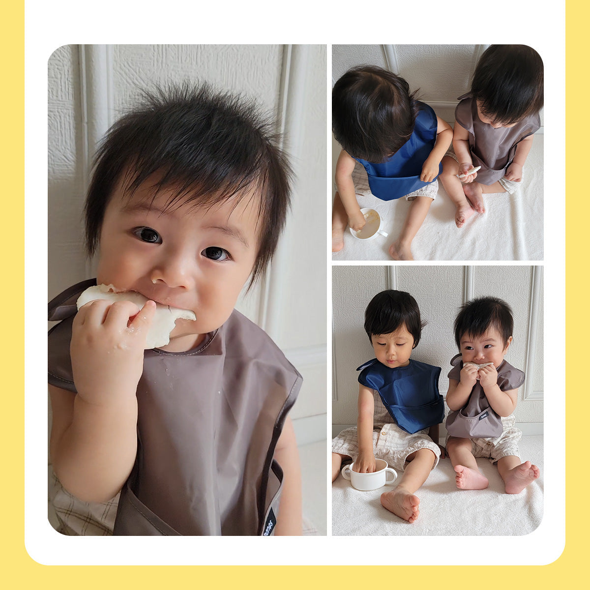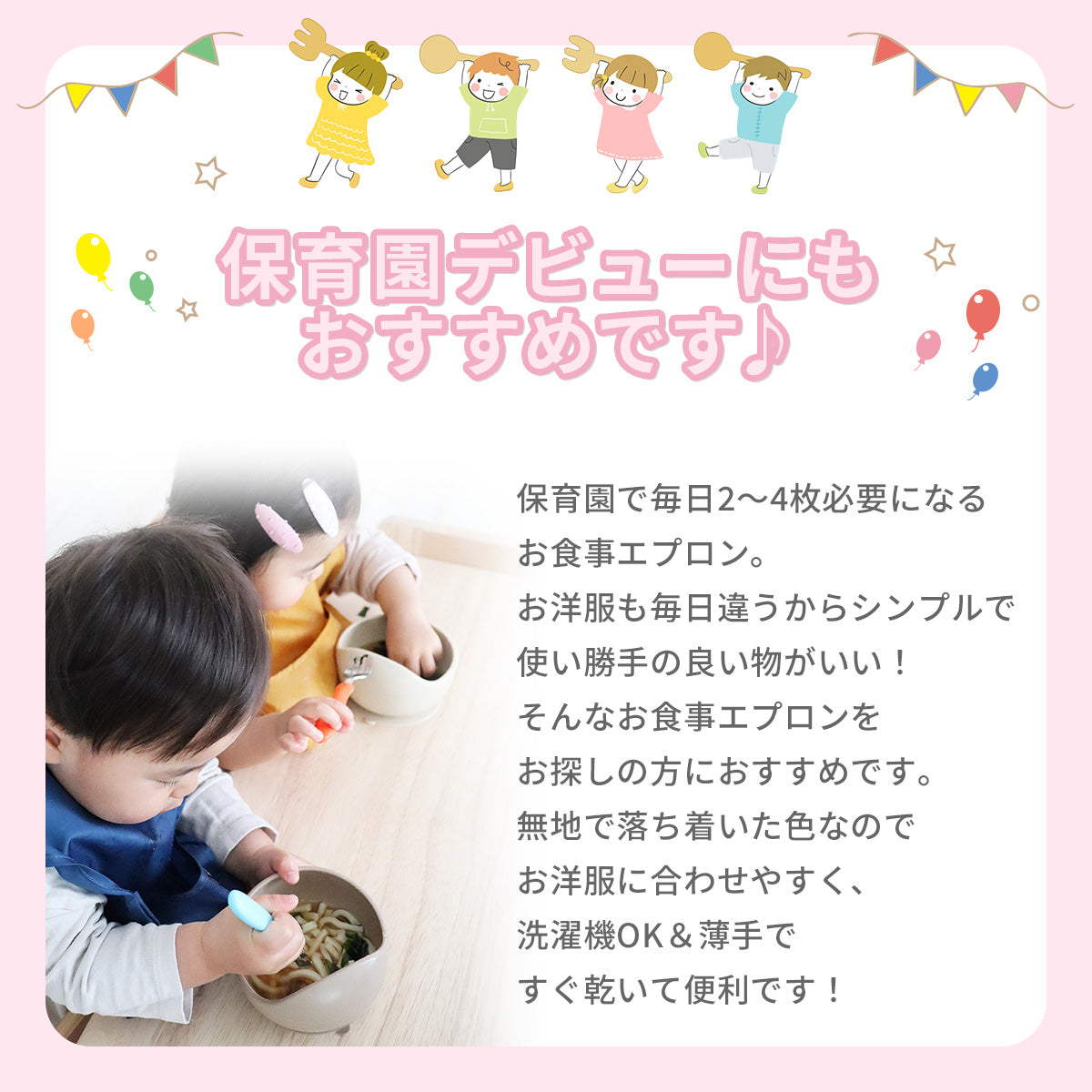 お家でのご飯タイムや保育園での給食時に何枚あっても助かる、お食事エプロン。