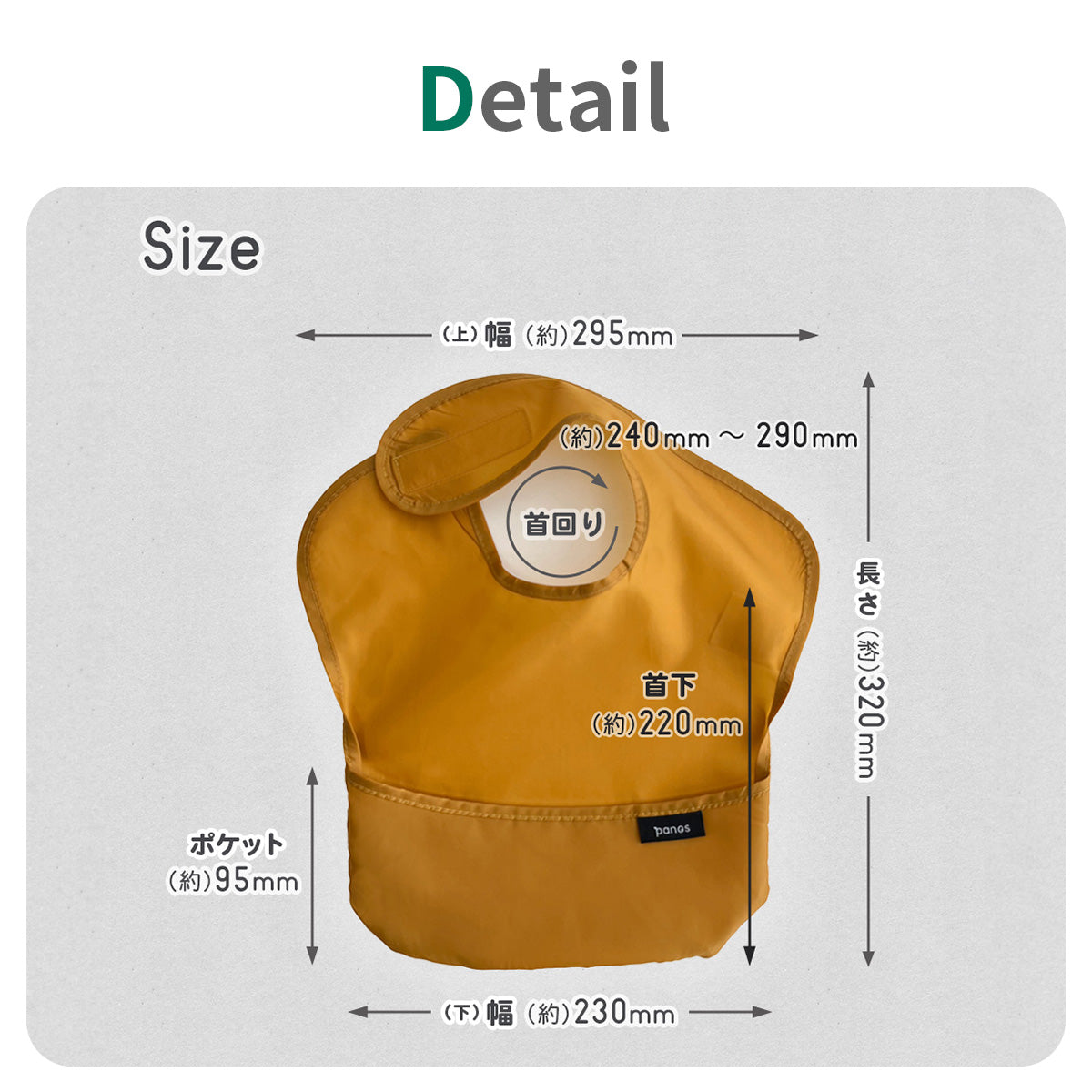 サイズ(約) | 横230-295×全長320×首周り240-290mm、首下220mm、ポケット95mm |