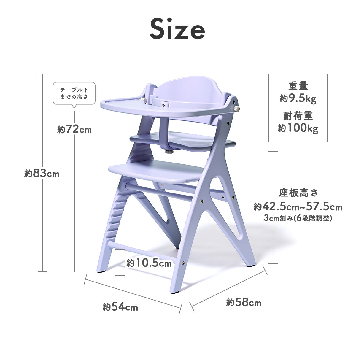 サイズ | 約 幅54cm×奥行き58cm×高さ83cm 座板の高さ:57.5~42.5cm(3cm刻みで6段階調整) |