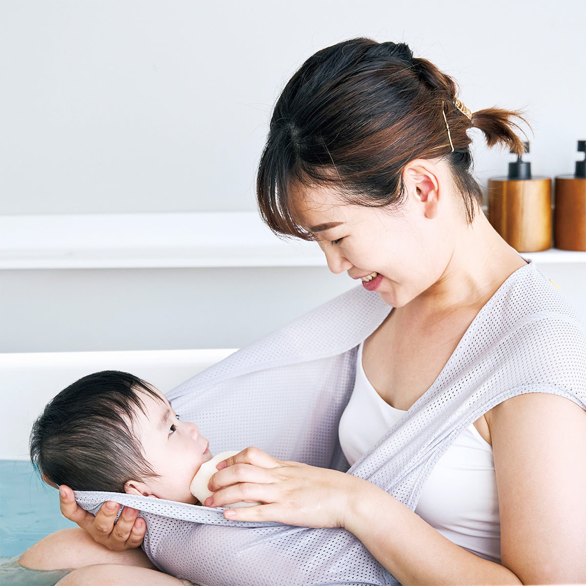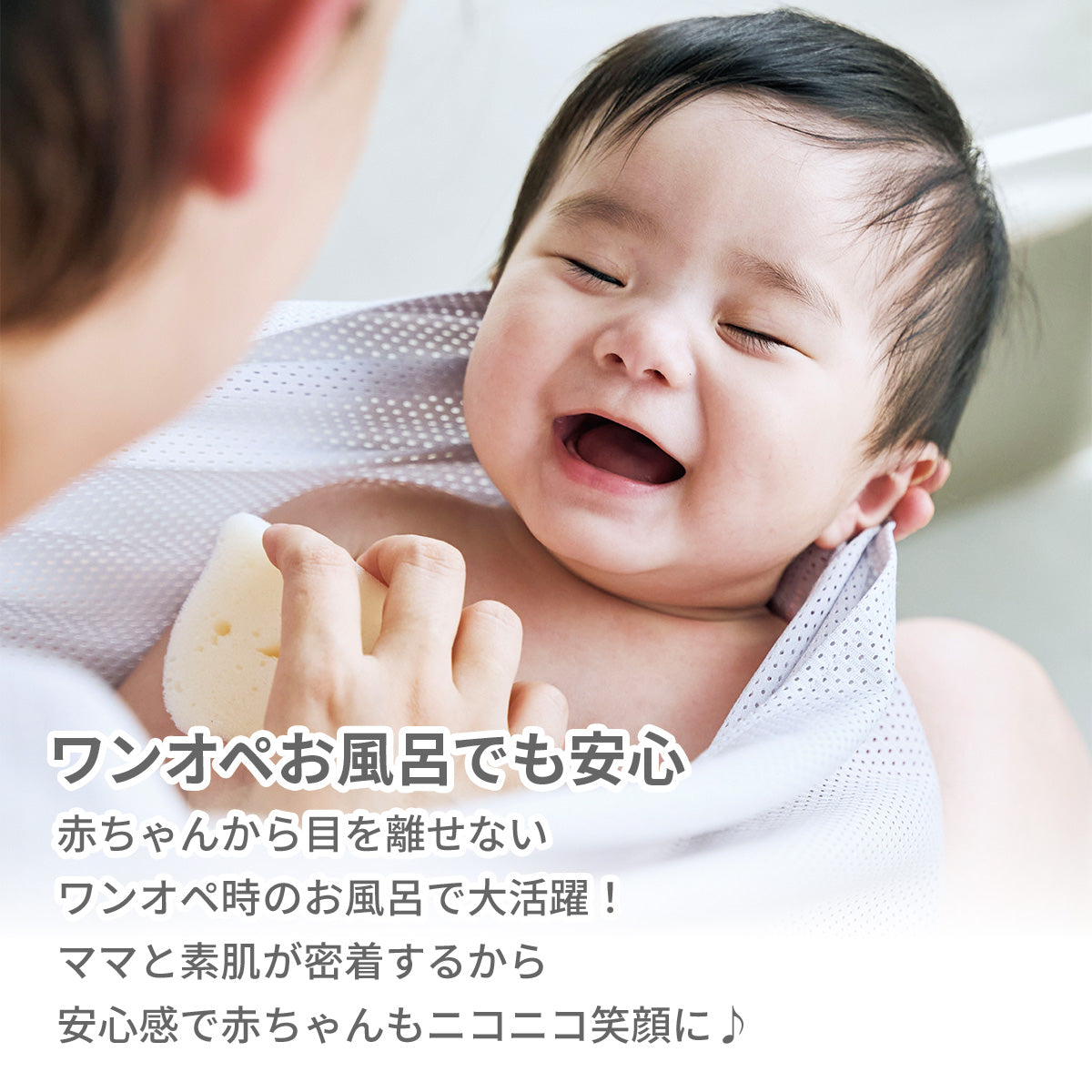 ママは「親子くるむん」の中にいる赤ちゃんをしっかり洗えて、さらにママの手首にかかる負担も軽減!