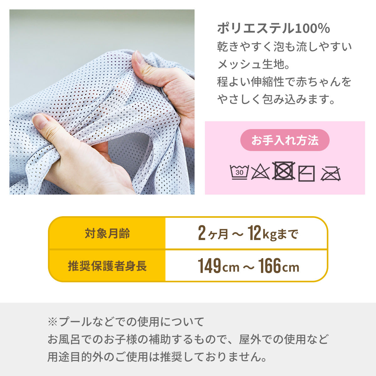 ・本製品はお風呂でお子様の補助をするものです。屋外での使用など用途目的外のご使用はおやめください。