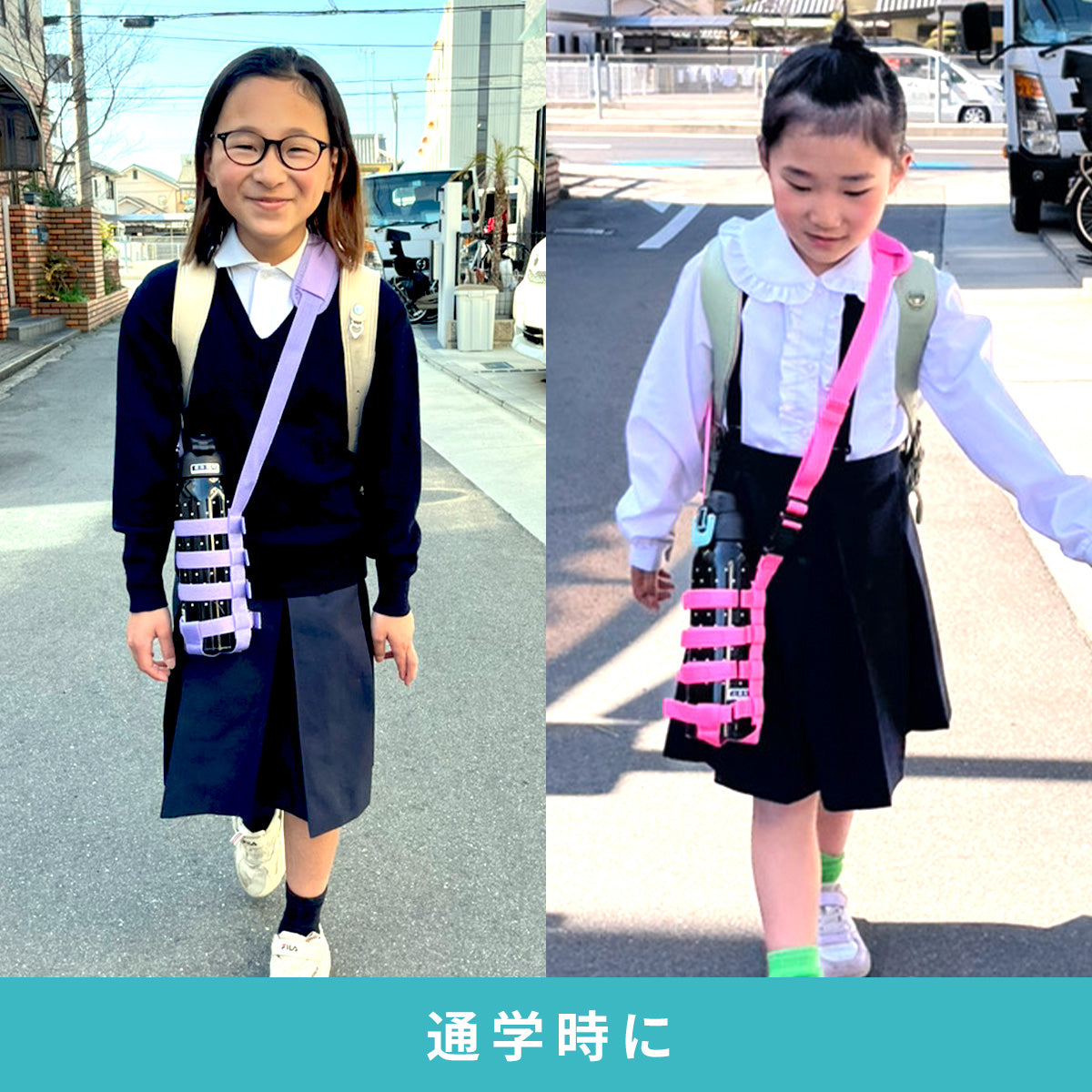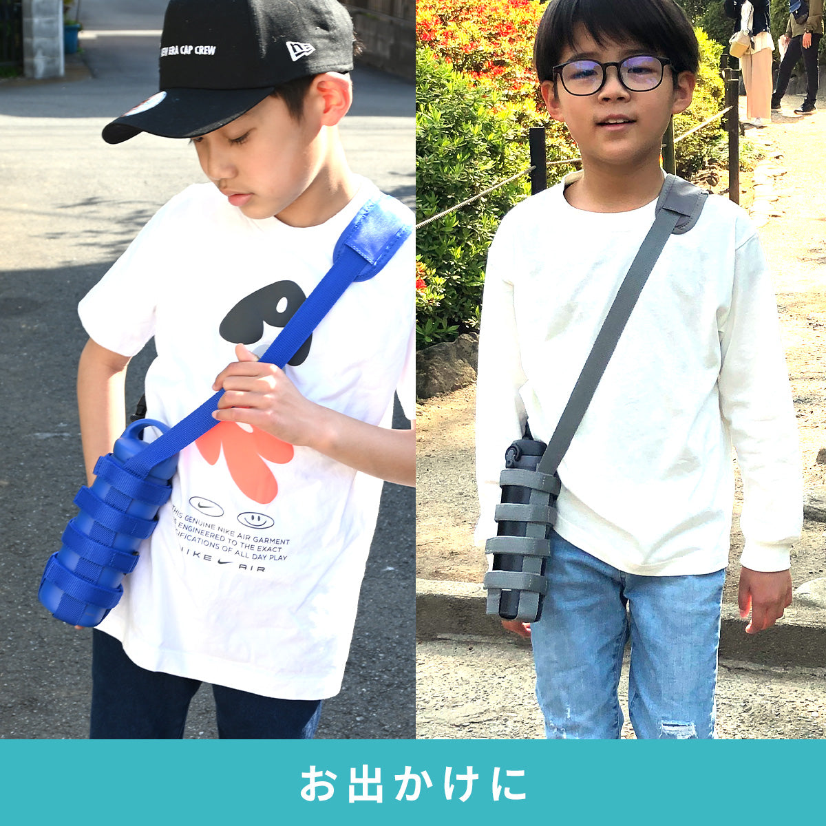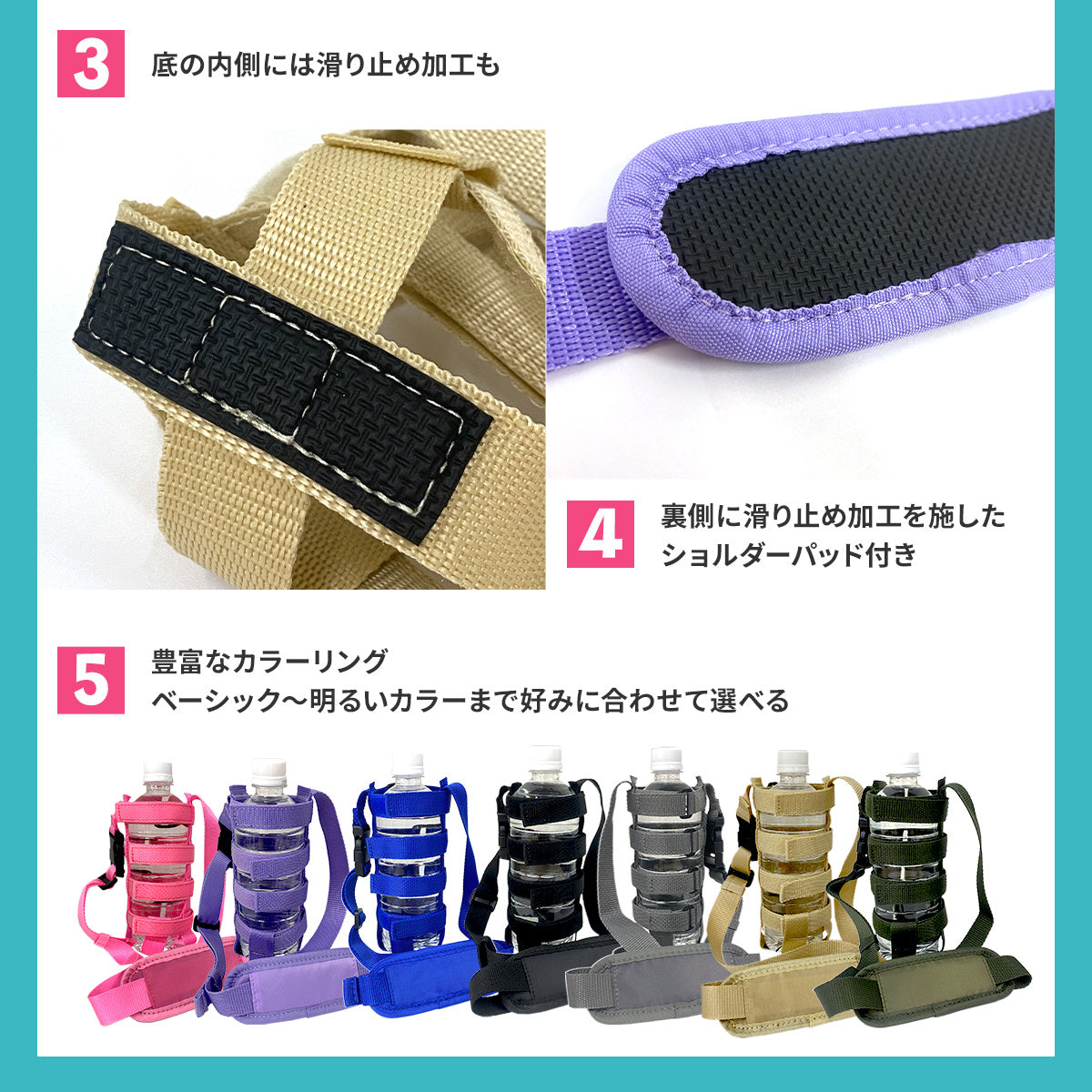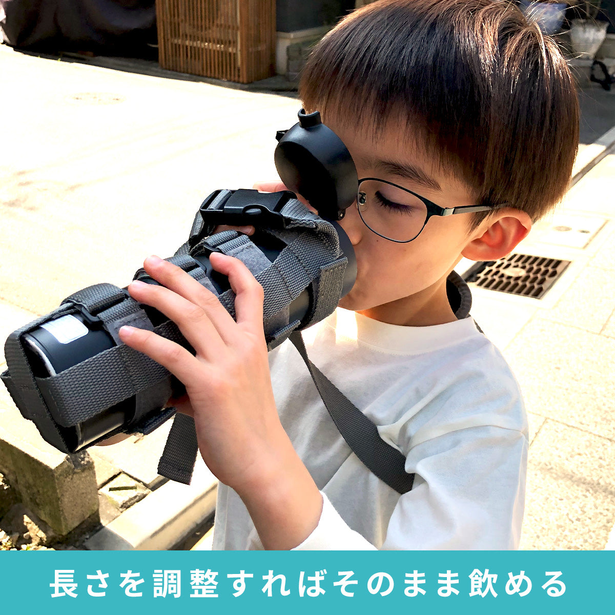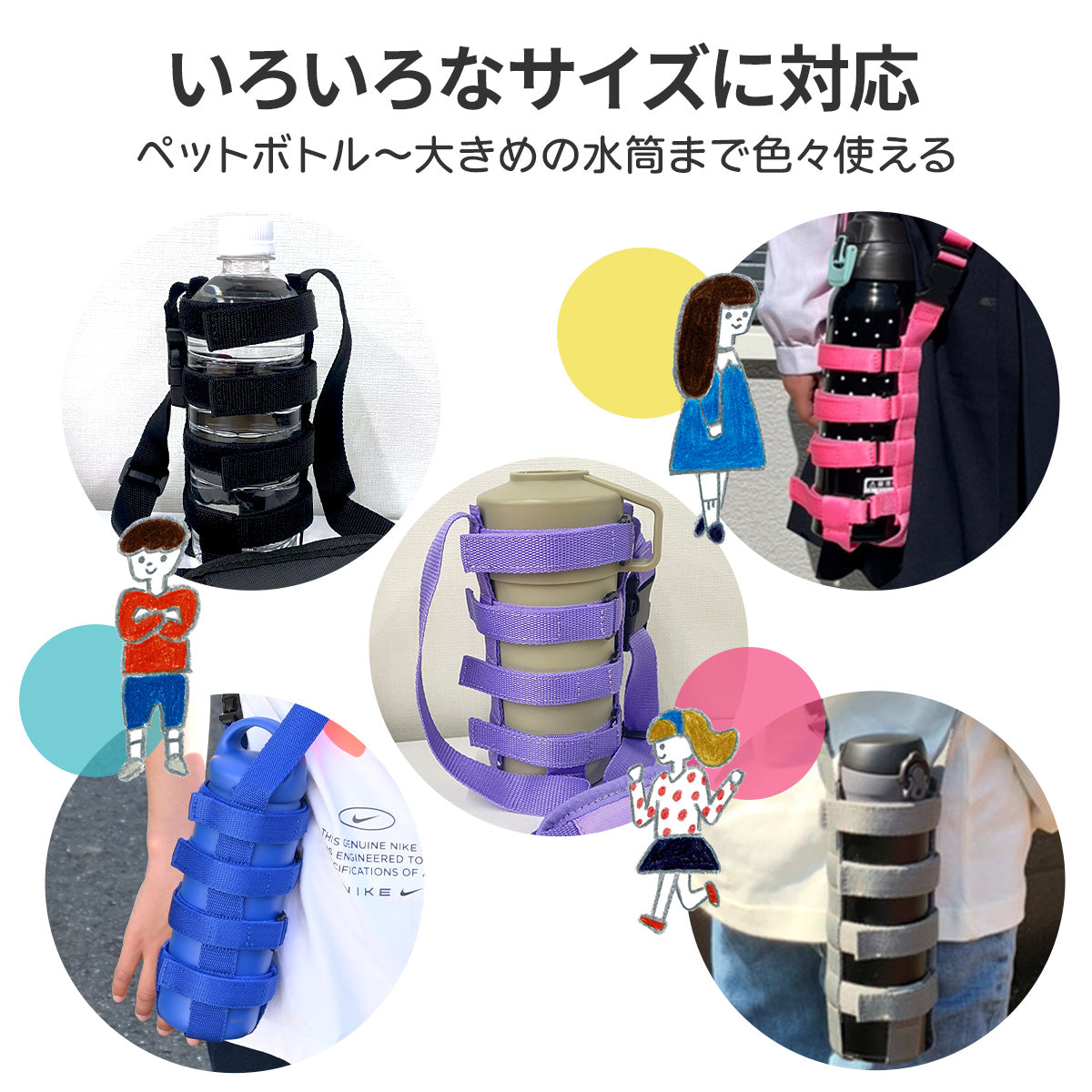 スリムな水筒や少し大きめの水筒、様々なサイズのペットボトルなど、ループストラップを調整すれば持ち歩きが楽々♪