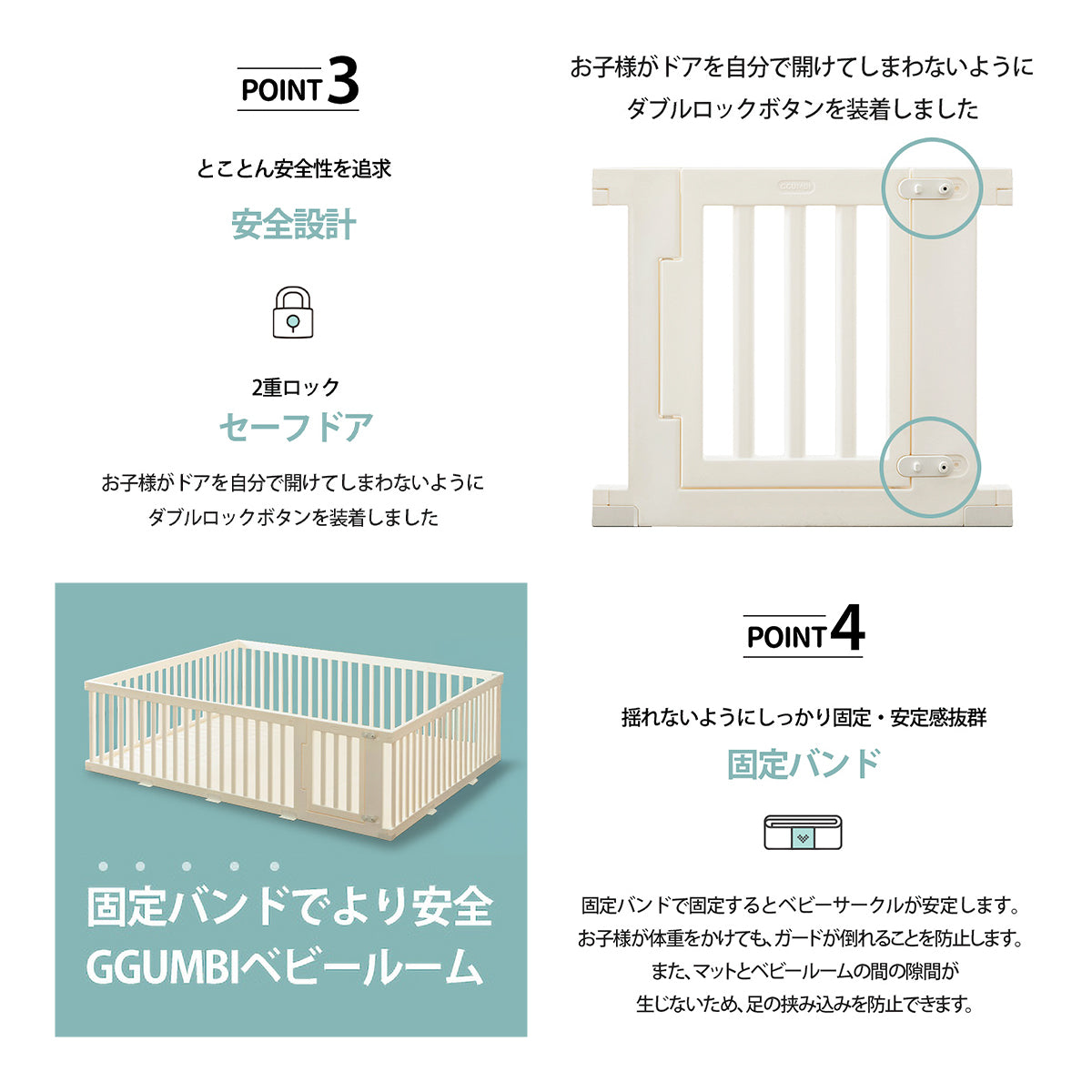 Ggumbiのベビーサークル「クリーンラッキーガード」は、お子様の安全をしっかり守るための頼れるアイテムです。危ない場所をしっかり仕切り、お子様が安心して遊べる空間を作ります。